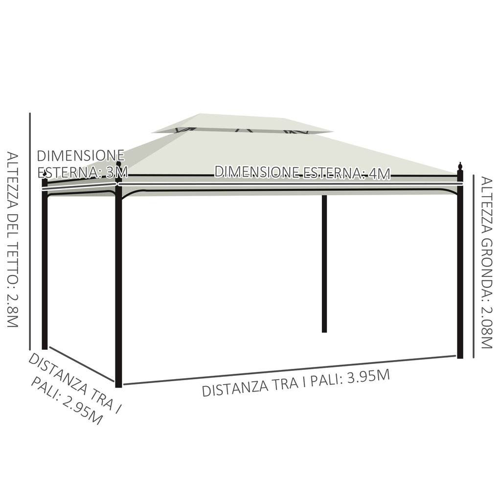 Tonnelle de jardin 3x4m en acier avec tôles latérales et double toit crème
