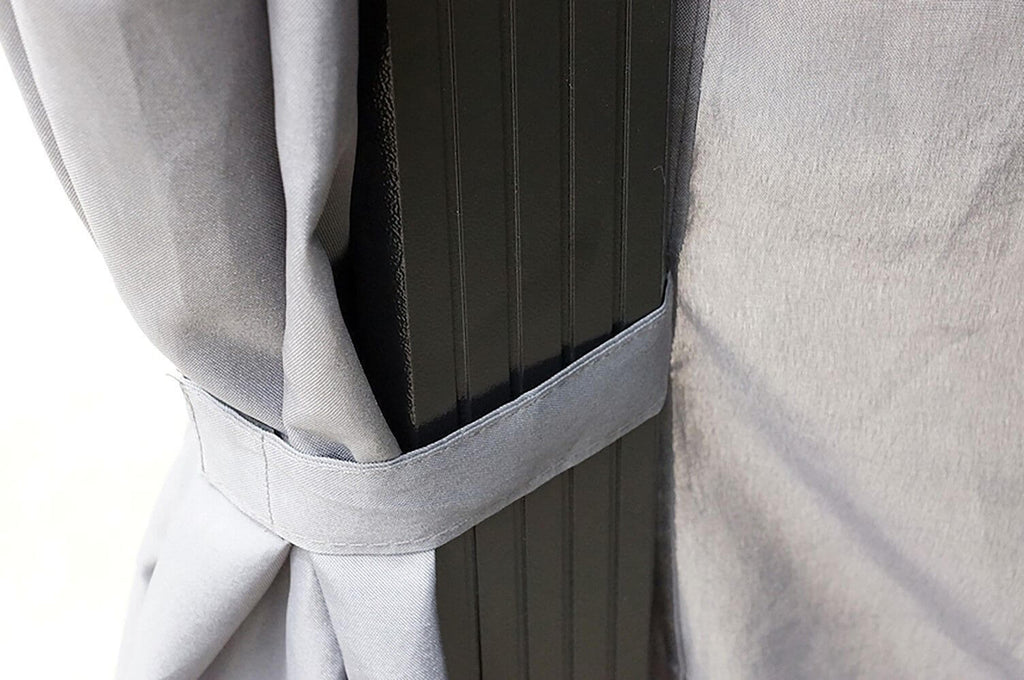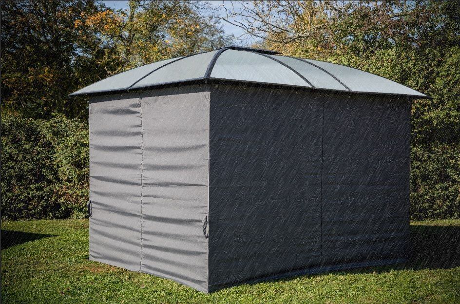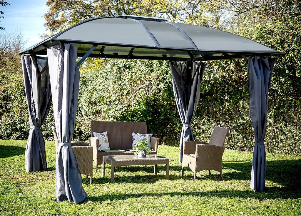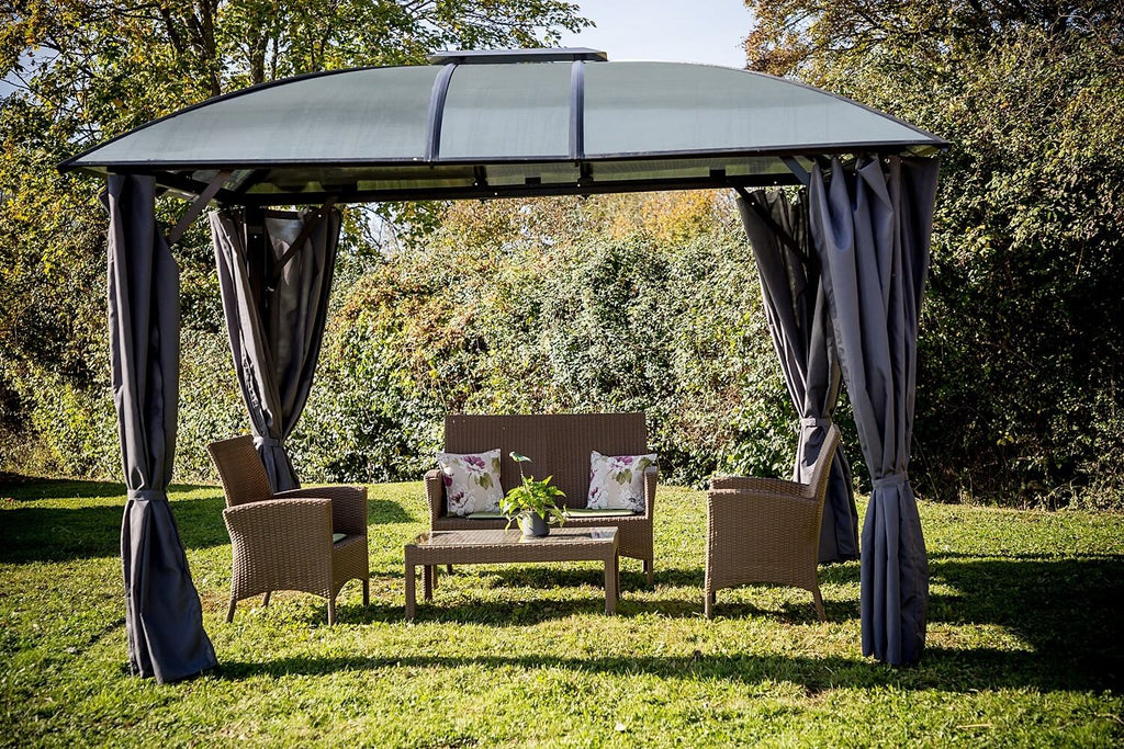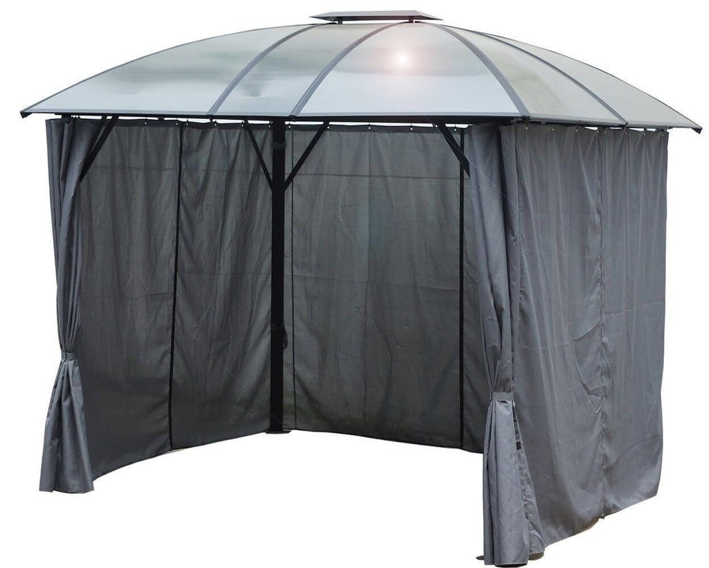 La tonnelle avec 4 rideaux latéraux zippés en polyester allie design, durabilité et facilité d'entretien. Le toit arrondi de 1/2 mm fabriqué à partir de panneaux en polycarbonate résistant aux UV de 6 mm protège contre les reflets nocifs et les rayons UV du soleil tout en restant lumineux. La toiture est équipée, en partie haute, d'une ventilation centrale, idéale pour la saison chaude.