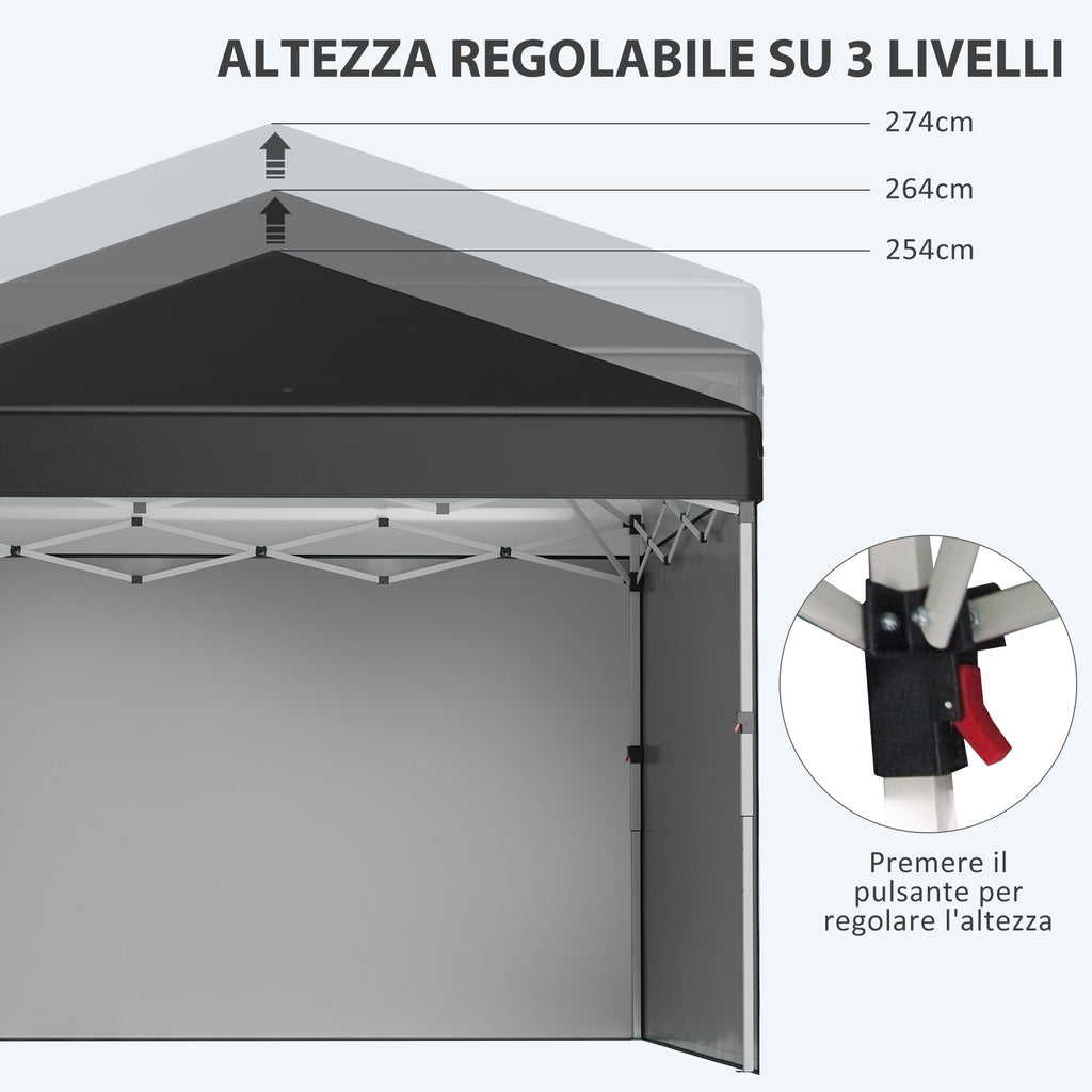 - TETTUCCIO REGOLABILE: Personalizza facilmente l'altezza della tua tettoia per adattarla all'occasione. Il nostro gazebo 3x3 è infatti dotato di gambe regolabili in altezza che si bloccano in posizione premendo semplicemente un pulsante. Alza o abbassa il tettuccio in tre possibili impostazioni di altezza: 274, 264 o 254 cm