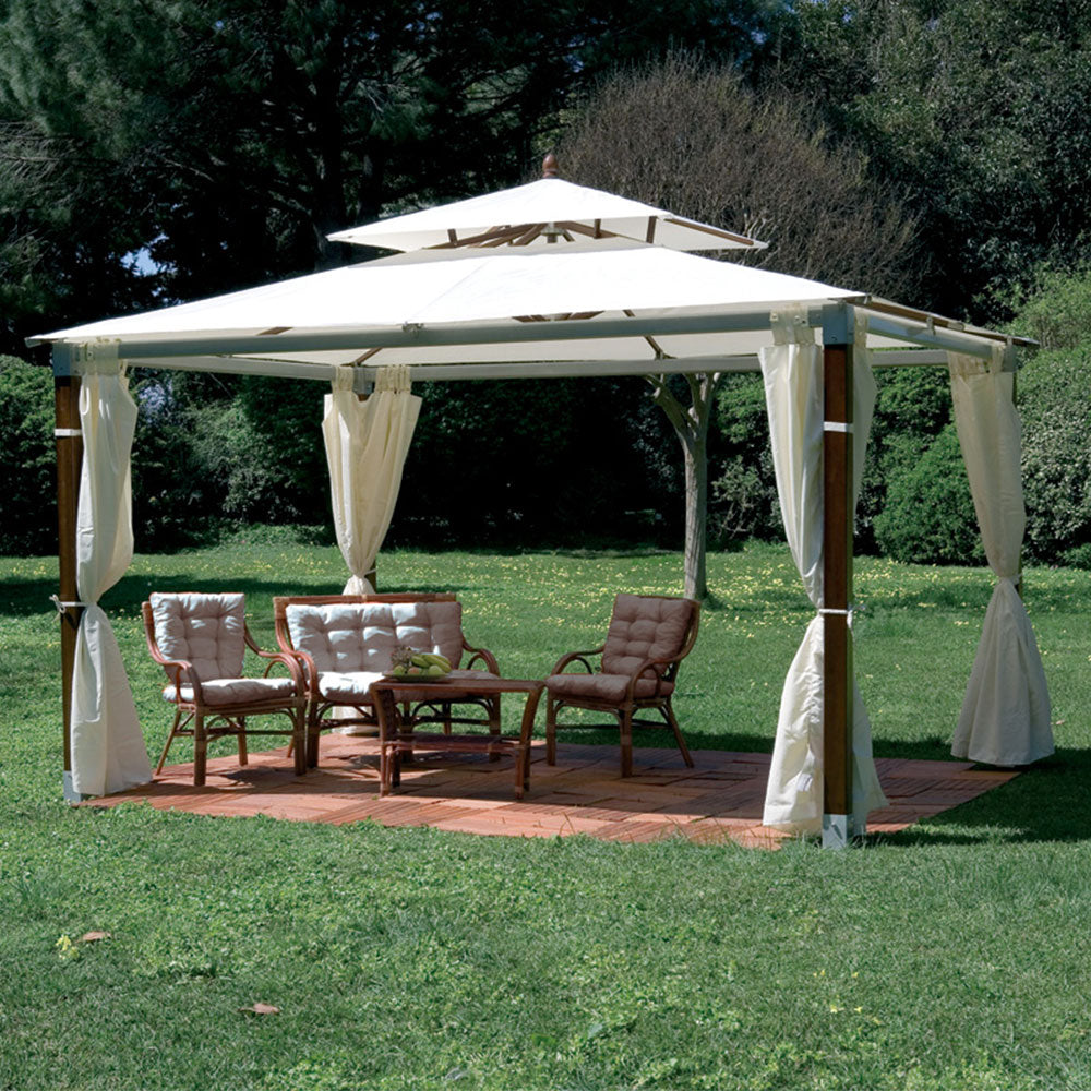 Gazebo avec structure en aluminium anodisé et poteaux en bois indonésien.