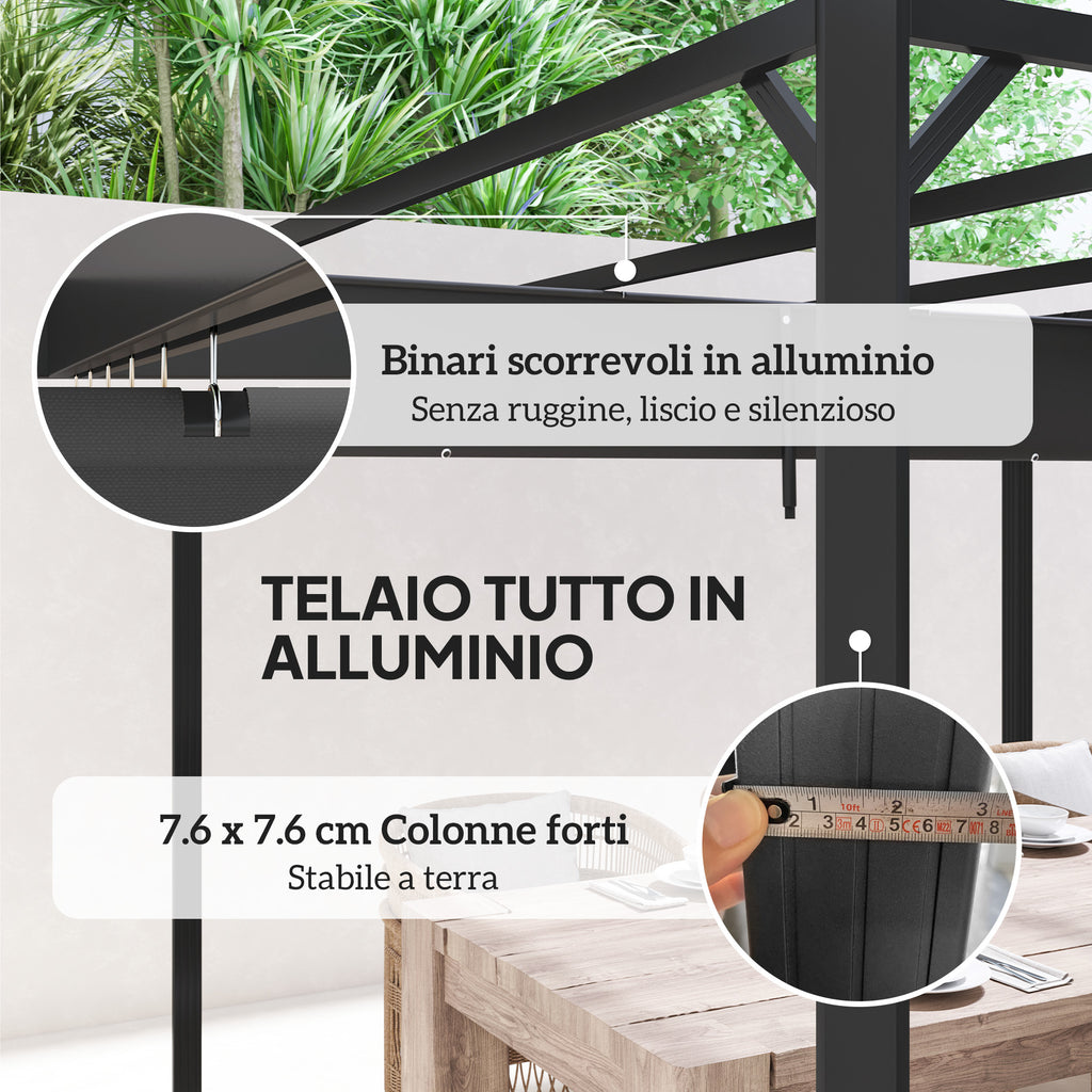 • IN ALLUMINIO: Questa pergola per giardino è realizzata in alluminio leggero e antiruggine per assicurarti durabilità nel tempo e facilità di movimento grazie alla presenza dei binari scorrevoli in alluminio