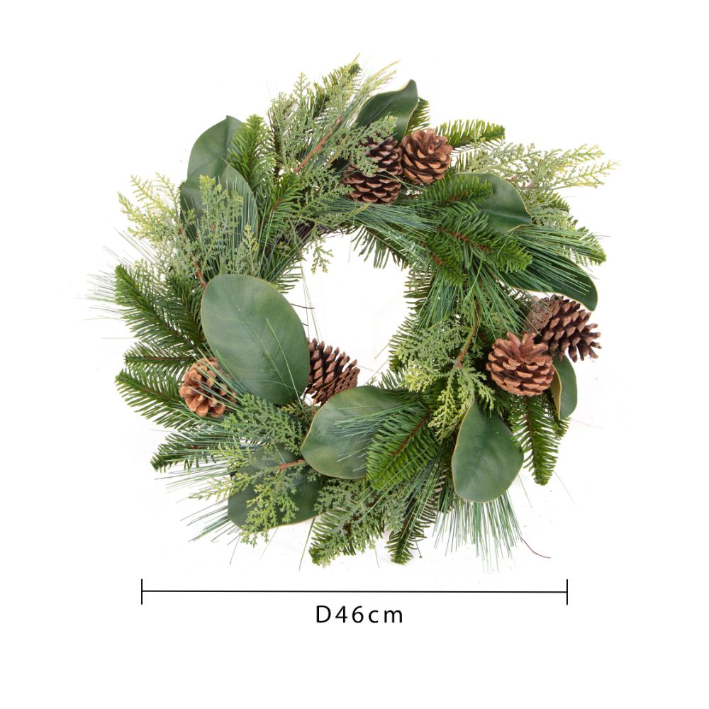 - La couronne est composée de pommes de pin et de feuilles de haute qualité.