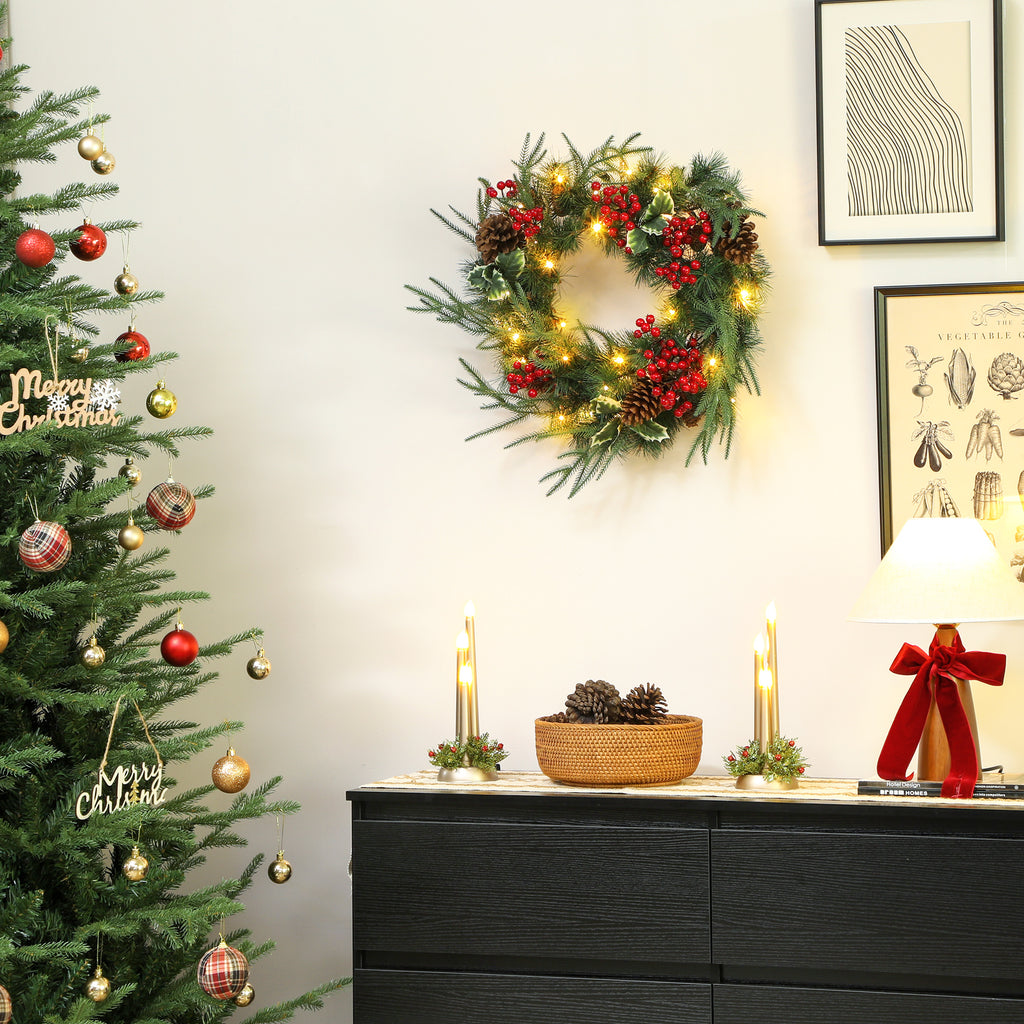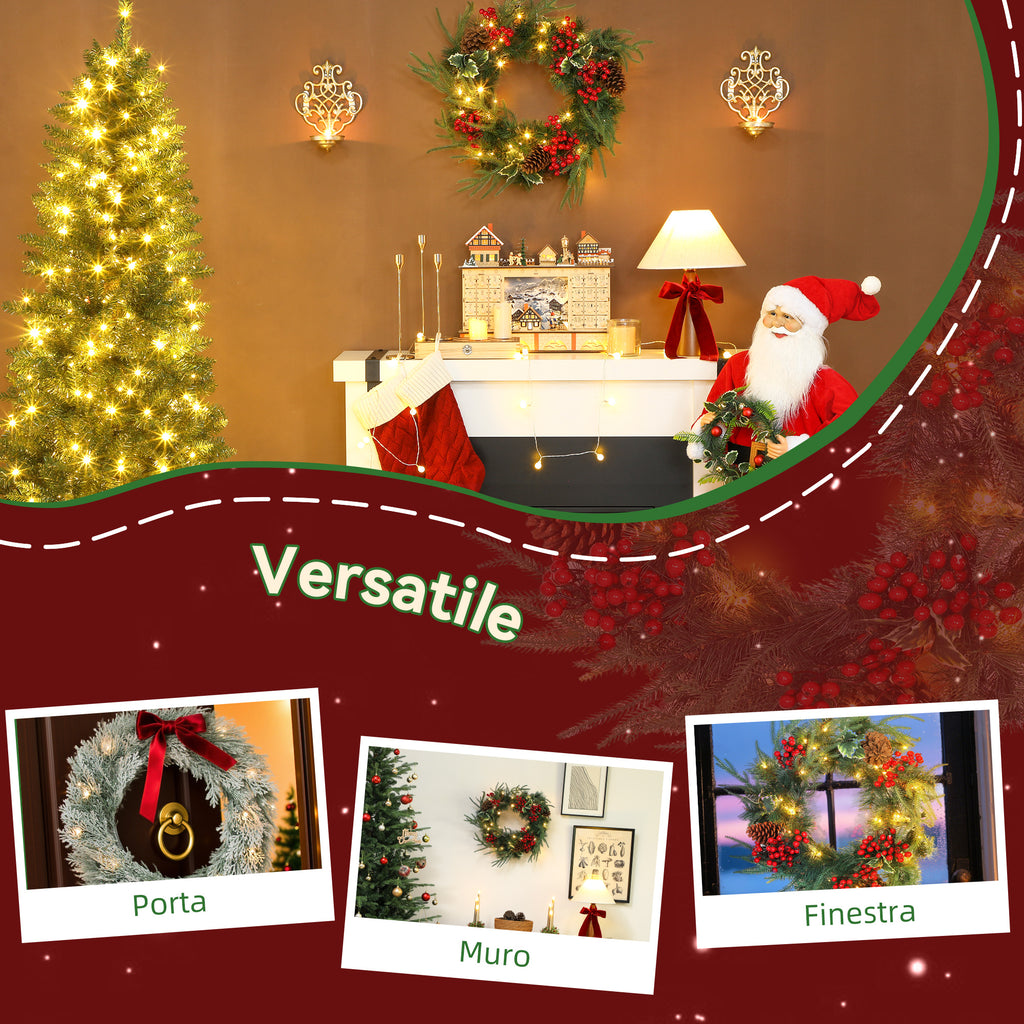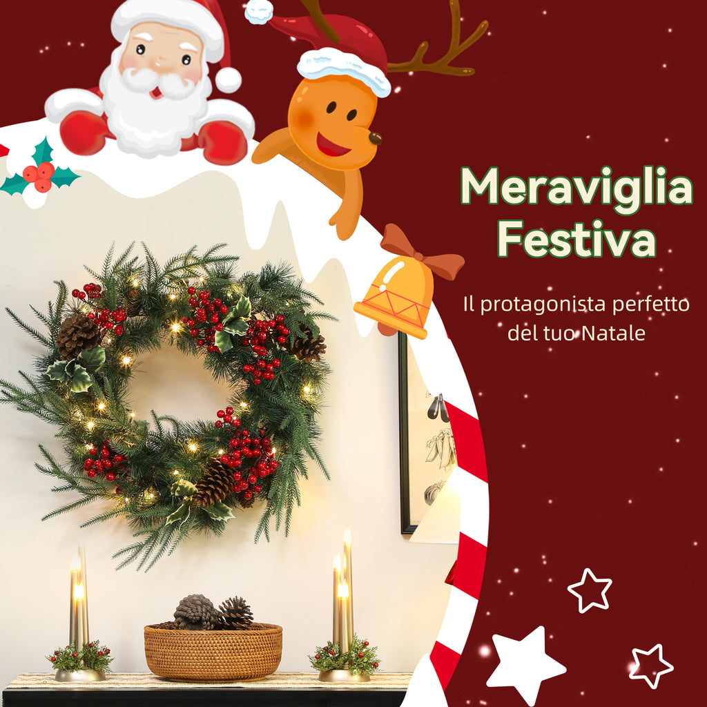 Ghirlanda Natalizia 60cm con 35 LED, Timer, Pigne, Bacche e Agrifoglio