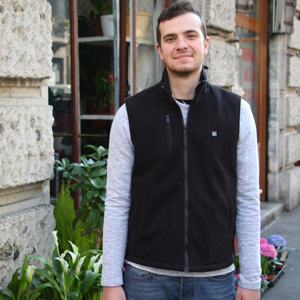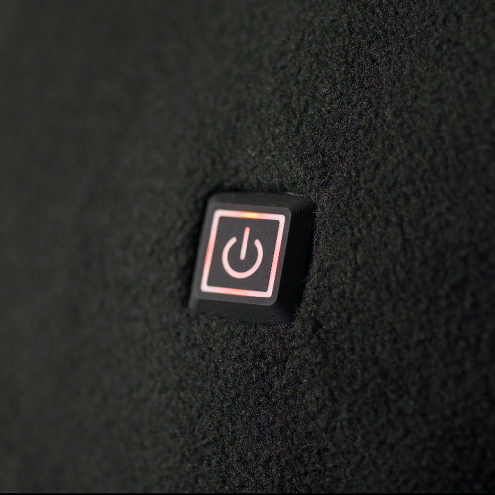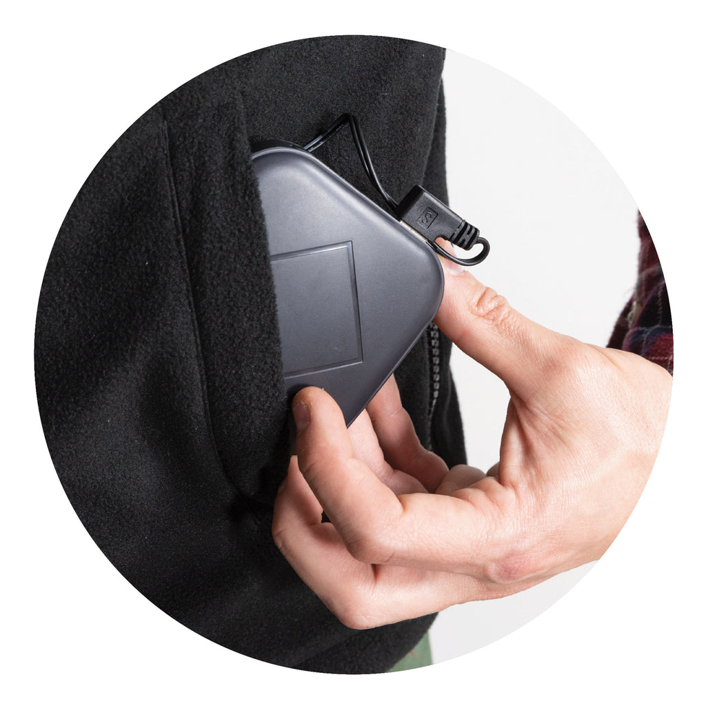 Il s'active en un clic, sans attendre que la pièce chauffe et sans gaspiller de chaleur inutilement : il suffit de brancher une simple batterie externe dans la poche gauche et d'appuyer sur le bouton d'activation de la chaleur.