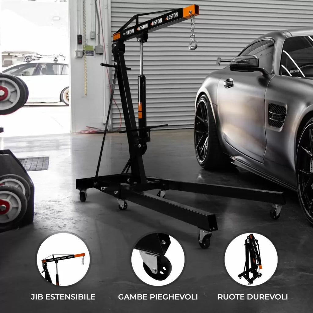 Grue Hydraulique pour Atelier Capacité 1000 Kg avec Pompe Hydraulique et Roues Noir