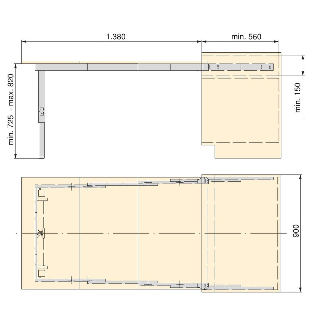 La table Party est conçue avec un système d'extraction rabattable à double pieds télescopiques, ce système est conçu pour la cuisine même s'il peut être utilisé dans d'autres pièces de la maison. Le système Party peut être installé en modules d'une largeur de 900 mm et d'une profondeur minimale de 560 mm, obtenant ainsi une longueur de table de 1 380 mm et une capacité de charge de 100 kg.La table est obtenue au moyen de 3 plateaux qui s'ouvrent avec à l'aide de charnières, les plateaux sont logés dans le même espace que le mécanisme lorsque la table n'est pas utilisée. La façade du meuble après avoir rangé la table doit avoir des charnières pour son ouverture. La jambe est pliable et réglable en hauteur, de plus la jambe et les guides ont un système de verrouillage lors de l'utilisation de la table.Les tables qui composent la surface d'appui ne sont pas incluses.