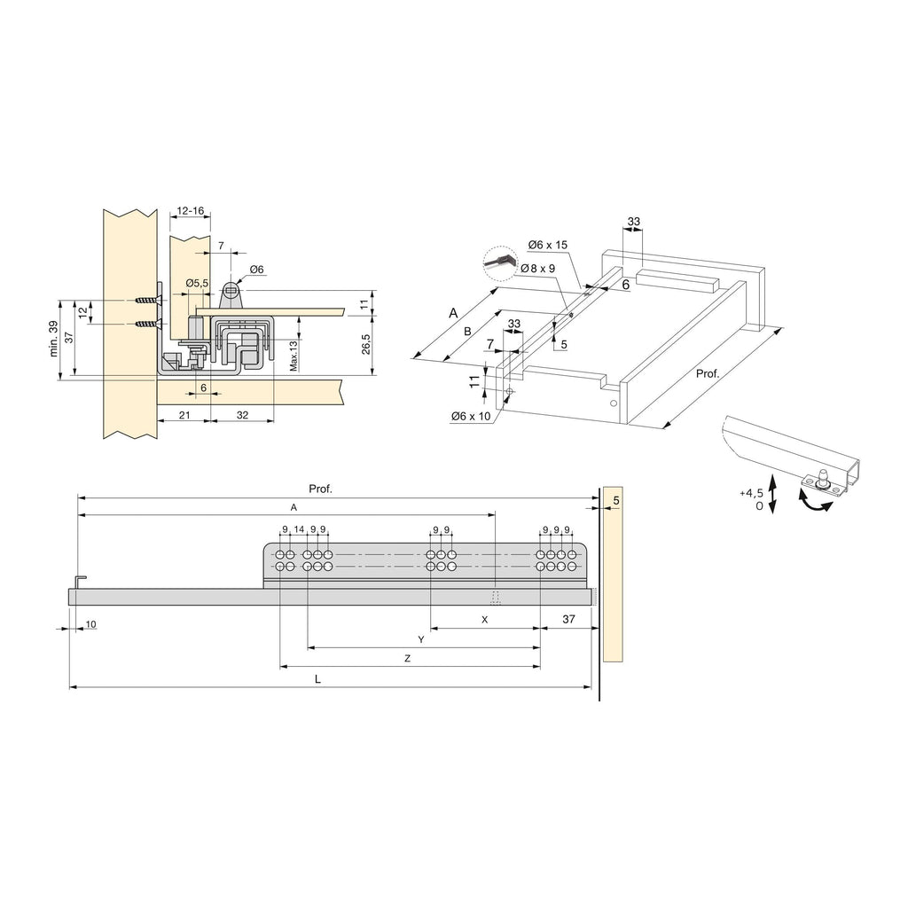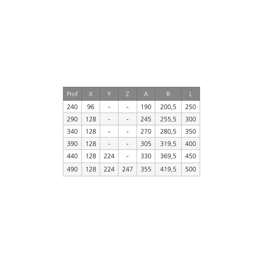 - Coulisses à sortie totale avec poussée pour tiroirs d'une profondeur de 290 mm.