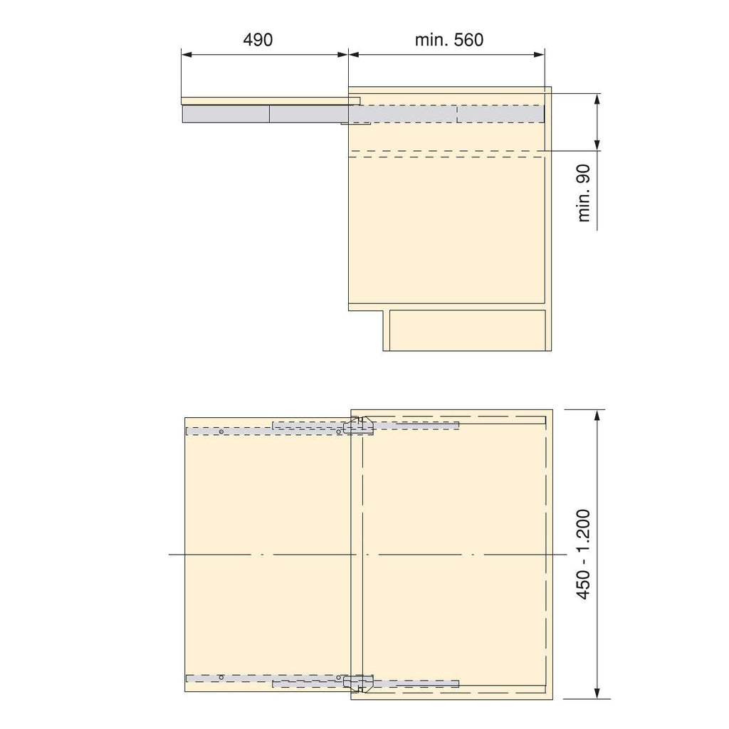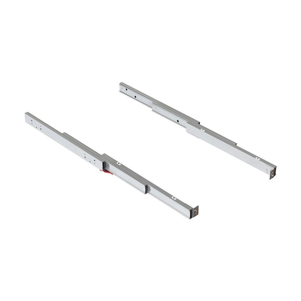 Le système doit être installé dans des modules d'une largeur comprise entre 450 et 1 200 mm et d'une profondeur minimale de 560 mm. Les guides du système permettent l'extraction d'une surface de 490 mm et une capacité de charge de 80 kg. De plus, ils disposent d'un mécanisme de verrouillage de sécurité pour éviter que la table ne se referme par inadvertance. La planche qui constitue la surface d'appui n'est pas incluse.