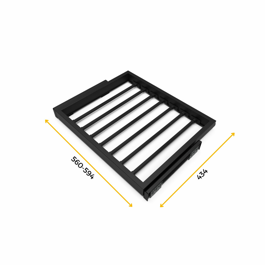 Kit composé de 7 tringles à pantalons et d'un cadre avec guides réglables en largeur . Le Hack Rack pour accessoires de garde-robe est conçu avec un style minimaliste soigneusement conçu, qui se distingue par sa finition texturée en gris pierre ou noir , qui est la dernière tendance en matière de conception de garde-robe dans les chambres et les dressings. Rend le rangement des vêtements plus pratique grâce aux guides à extension complète à fermeture douce, qui permettent d'ouvrir et de fermer le cadre lentement et silencieusement pour éviter les chocs, avec des garnitures pour cacher les guides. Disponibles pour les modules de 600, 800 et 900 mm, les cadres de modules de 80 et 90 comprennent un plateau auxiliaire pour ranger les vêtements et les objets.