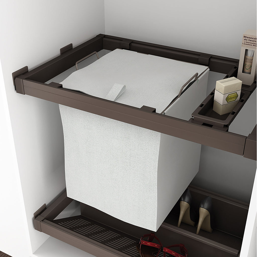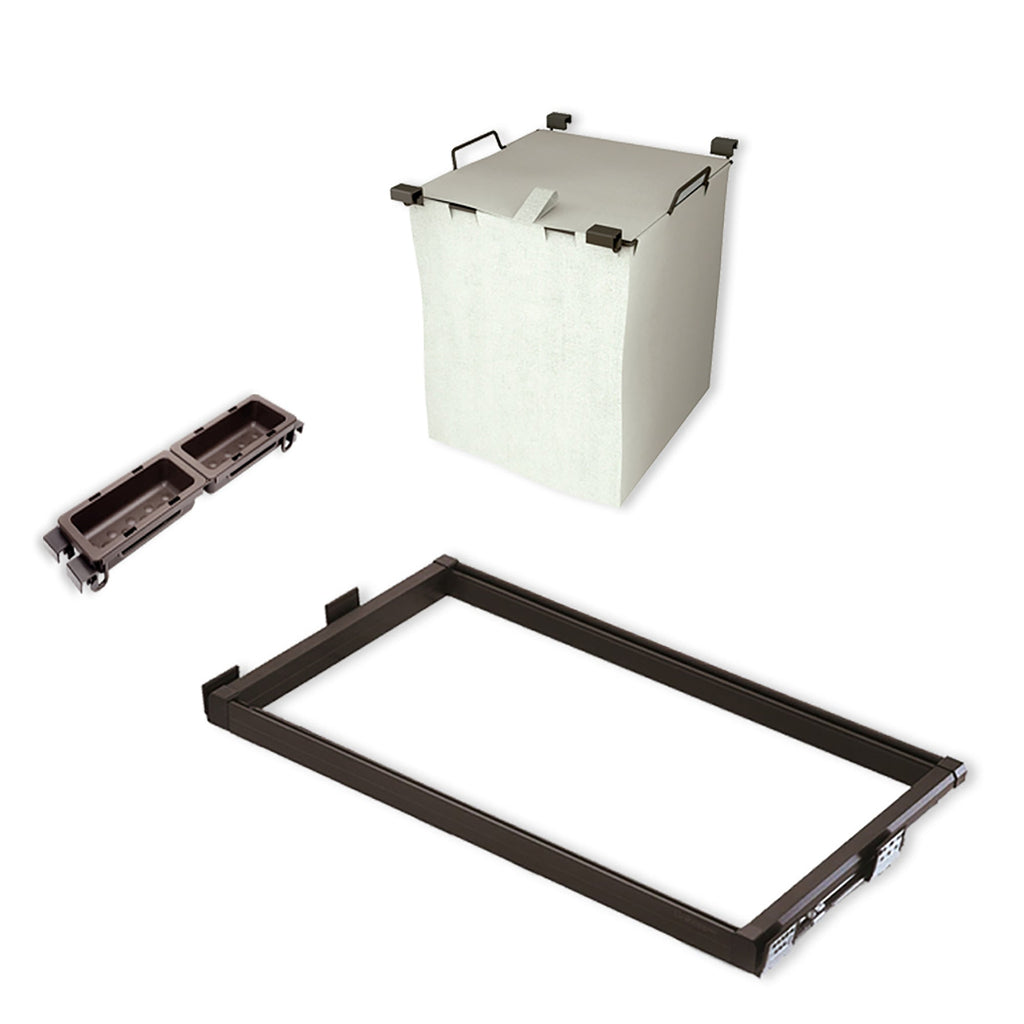 Kit composé d'un panier à linge en toile et d'un ensemble de plateaux et d'un cadre avec guides escamotables à extension totale et fermeture amortie , ainsi que d'un système de clip automatique et rapide pour l'installation du cadre . Il est réglable pour s'adapter au compartiment interne de l'armoire et est réalisé en aluminium verni moka . le panier à linge en toile écrue .