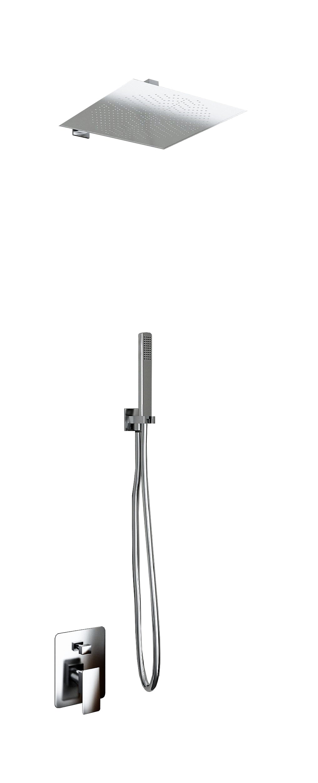 Kit de douche composé de : pomme de douche en inox avec bras en laiton chromé, buses en silicone anticalcaire, mitigeur de douche 2 voies à encastrer inclus, corps en laiton chromé + poignée carrée en laiton chromé, douchette en ABS chromé avec raccordement d'eau mural et flexible 150 cm en PVC.