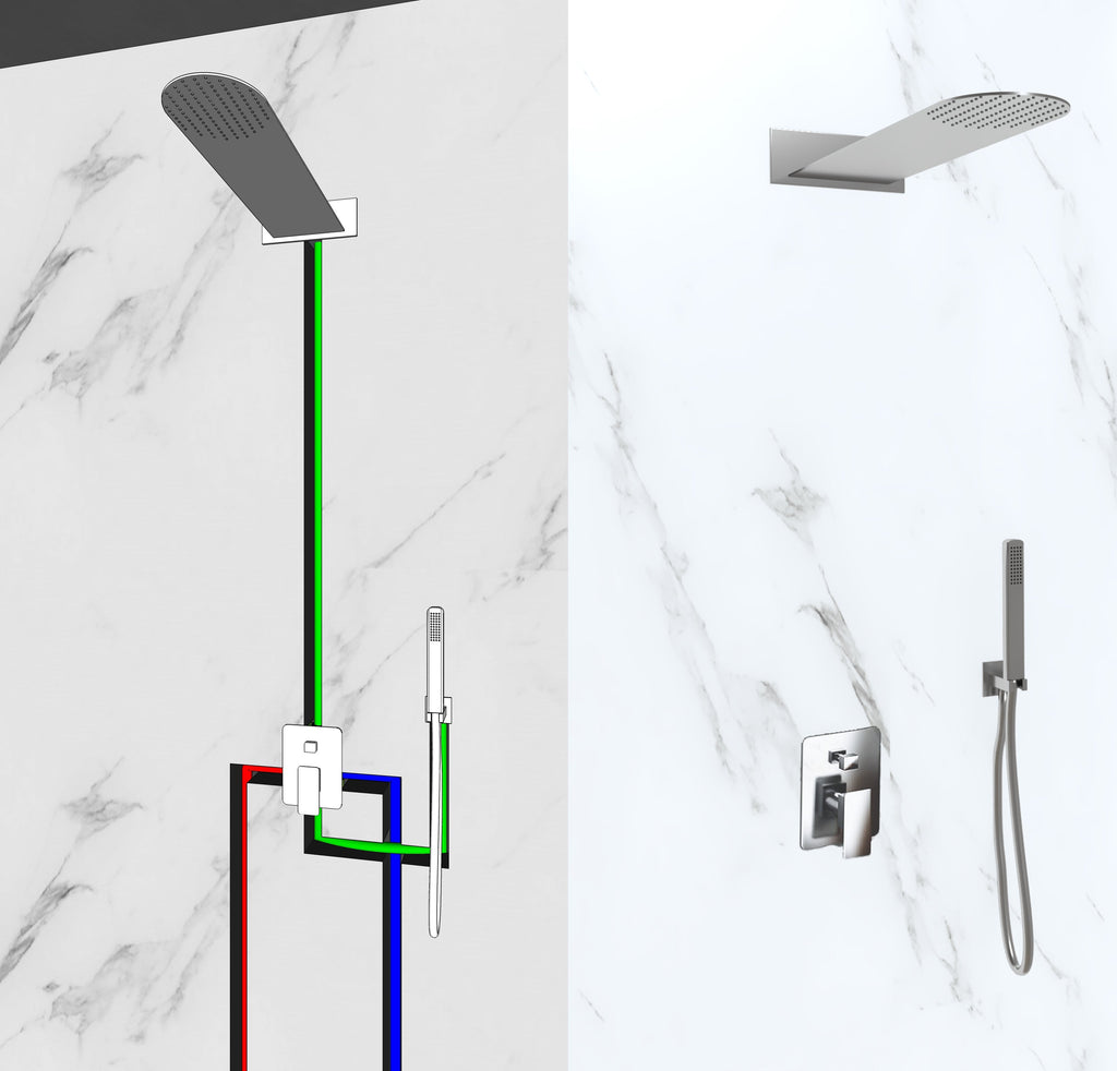 Le système doit être mis en place en installant le mitigeur intégré fourni et en préparant les sorties pour la pomme de douche et la douchette à main.