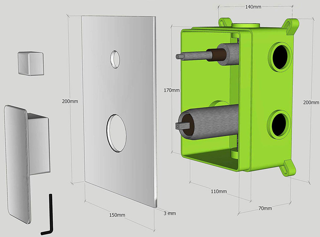 Kit de douche composé de : pomme de douche en inox avec bras en laiton chromé, buses en silicone anticalcaire, mitigeur de douche 3 voies à encastrer inclus, corps en laiton chromé + poignée carrée en laiton chromé, douchette en ABS chromé avec raccordement d'eau mural et flexible 150 cm en PVC.