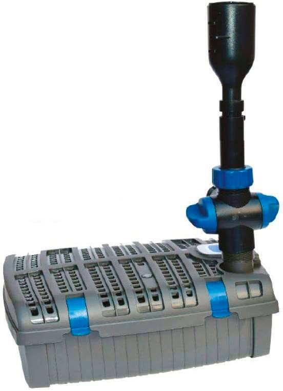 La pompe incluse est idéale pour les bassins jusqu'à 2000 litres. d'eau, le filtre est composé de deux éponges filtrantes différentes, une avec une porosité plus fine et une avec une porosité plus grossière, et des canolicchi céramisés pour créer une surface biologique. Ces trois éléments filtrants assurent un nettoyage mécanique et biologique, associés à la lampe UV de 11 watts pour garantir une eau claire. La pompe est également équipée de jeux d'eau afin de créer des effets spectaculaires en oxygénant l'eau. Cette pompe est extrêmement robuste et fiable et très pratique à entretenir.