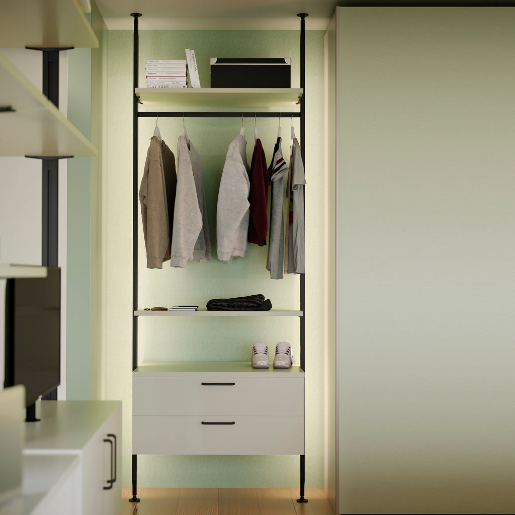 Kit staffe per struttura modulare Zero. Si compone di 4 set di staffe per mensole in legno, 1 set di staffe per barra e una barra per appendere da 1 m. Include tutti gli accessori per il montaggio sul profilo.