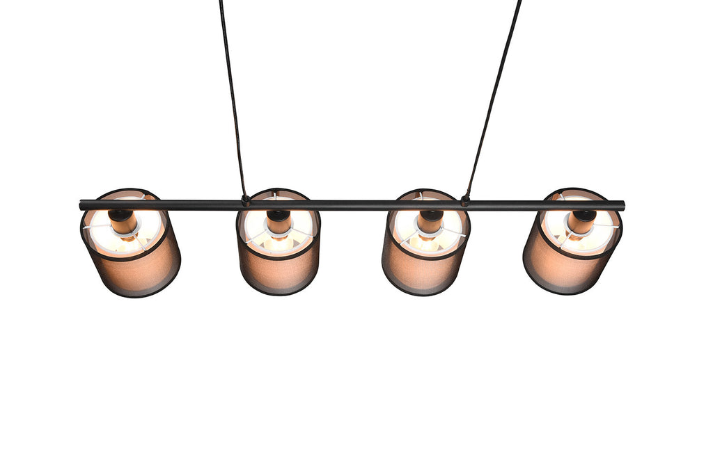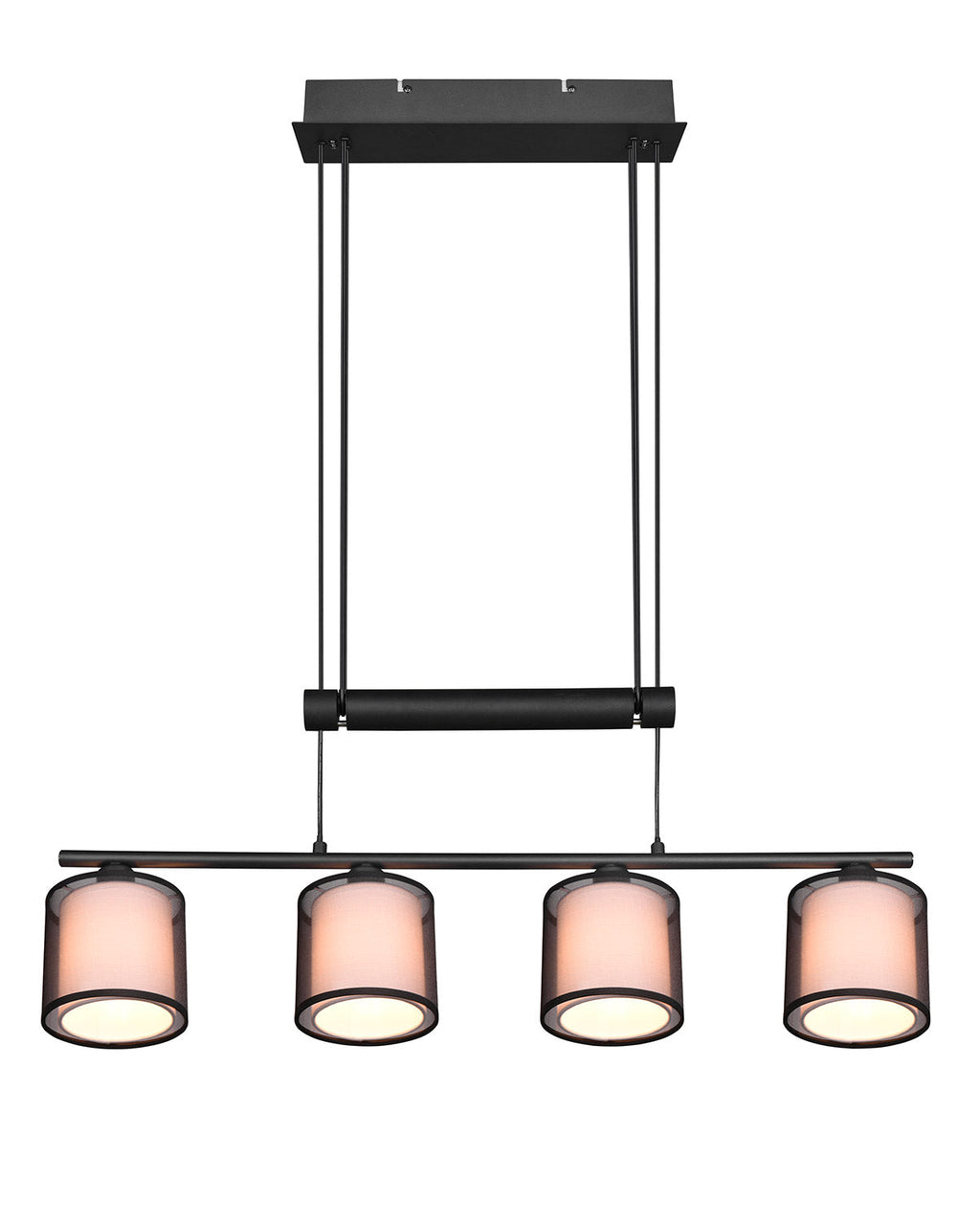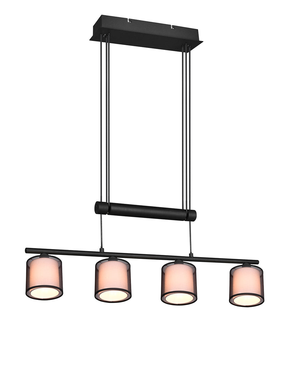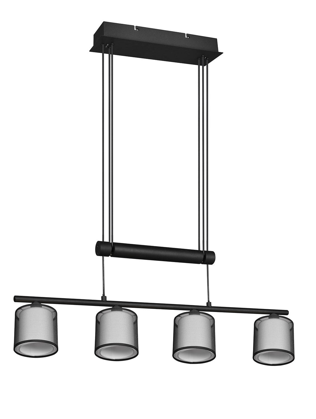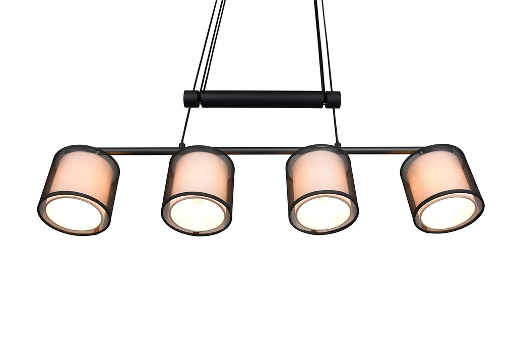 Burton Sospensione Metallo Nero 4 Paralumi Bianchi e Diffusori Esterni Traforati Neri con Sistema di Regolazione Altezza A Bilancere L. 83Cm