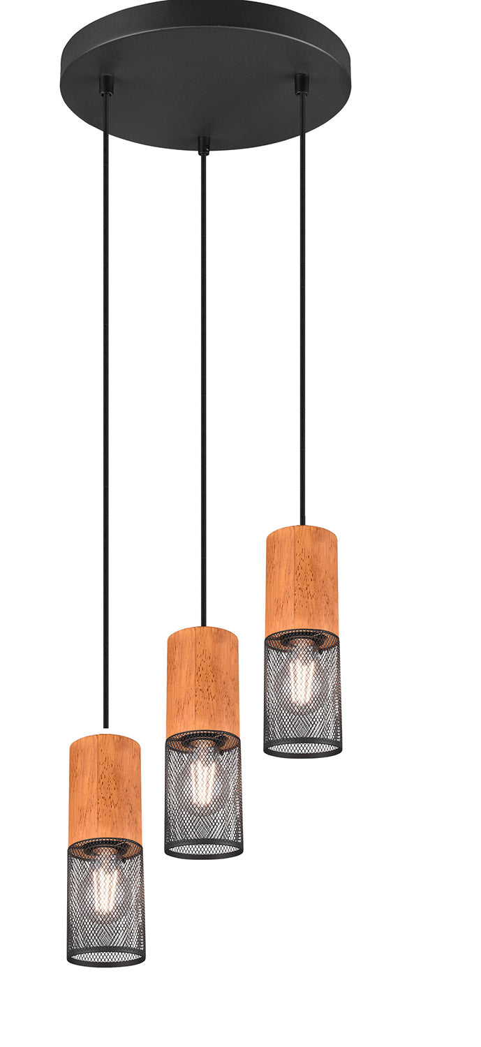 Tosh Sospensione 3 Cilindri Gabbia Metallo Nero Opaco e Legno D. 28Cm