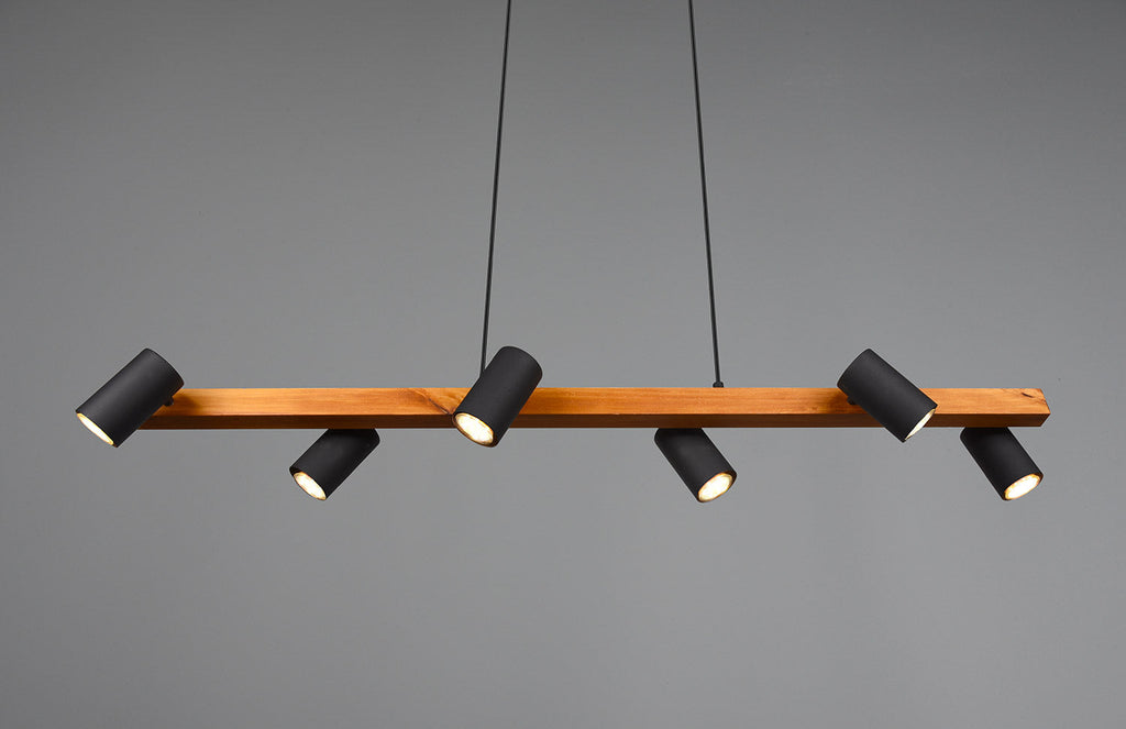 Marley Sospensione Rettangolare con Barra Legno 6 Cilindri Nero Opaco L. 115Cm