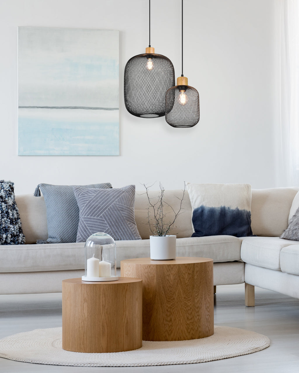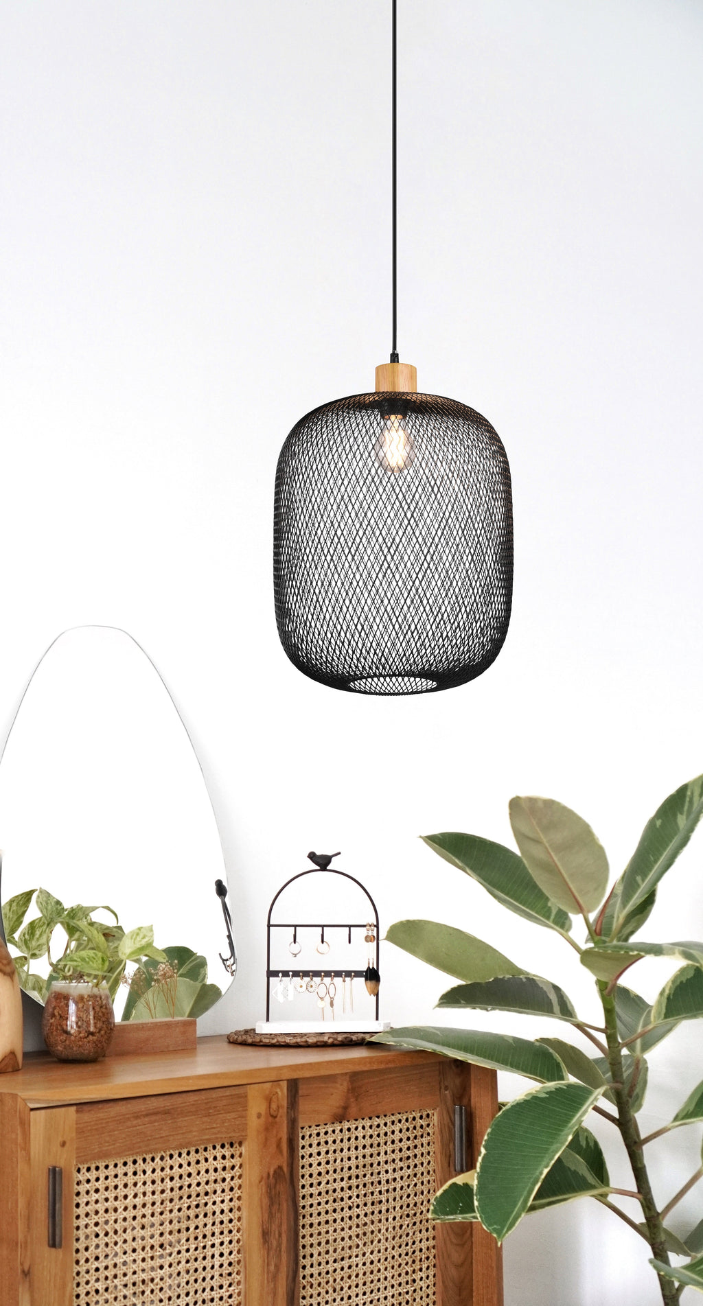 Calimero Suspension Maille Métallique Noire Avec Détail Bois Naturel D. 30Cm
