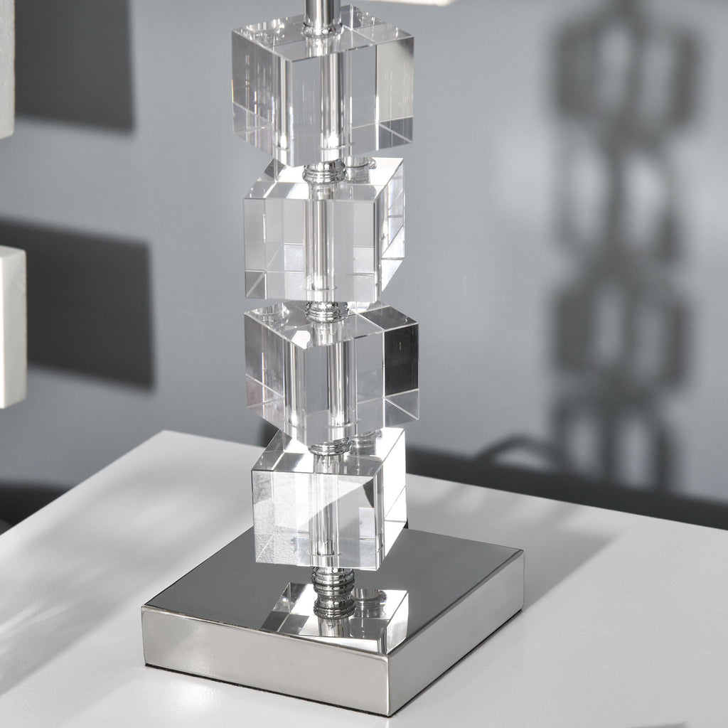 Apportez une touche de style à votre maison avec la lampe de table moderne de . Le mât avec des cubes de verre rotatifs fait briller la lampe et grâce à la large base, elle reste stable et bien équilibrée. L'abat-jour en tissu donne un effet chaleureux à la lumière, ce qui rend la lampe idéale pour être également utilisée comme lampe de chevet et comme lampe de bureau. Le long câble d'alimentation vous permet de le placer facilement où vous le souhaitez.