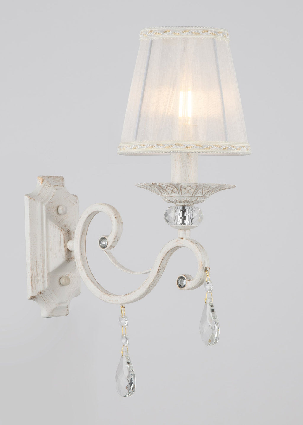 Structure en métal, finition blanc et doré. Abat-jour plissés en organza blanc. Pendentifs en cristal.