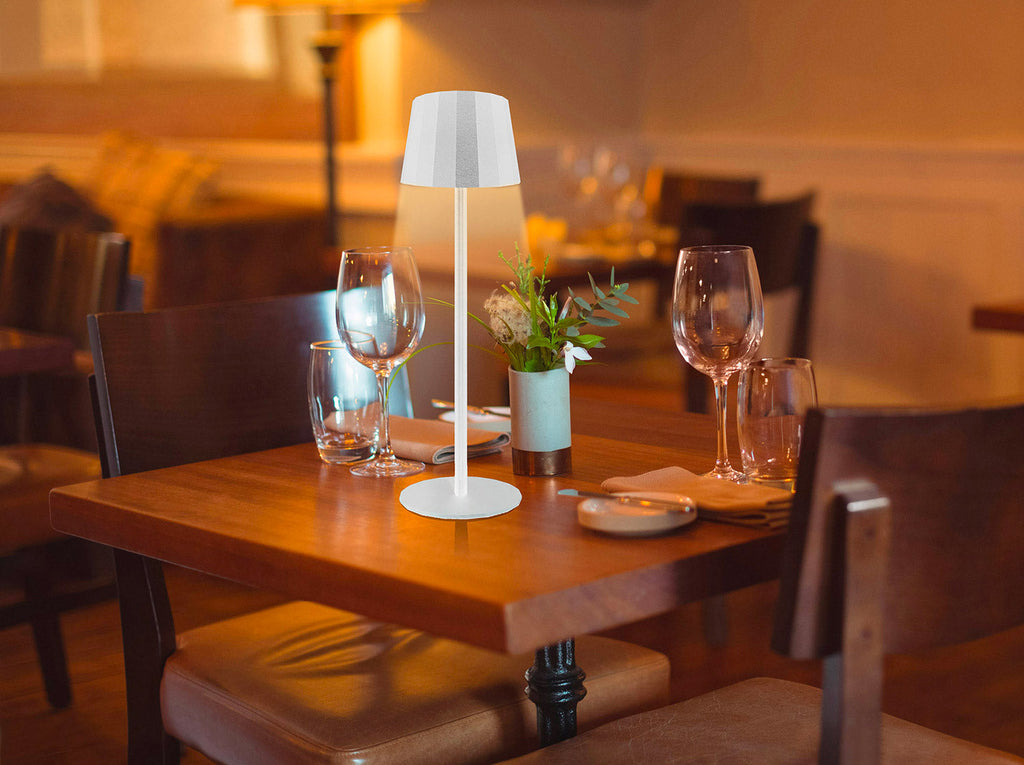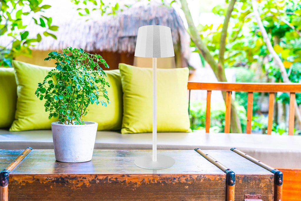 Questa lampada da tavolo è realizzata in ferro per la base e lo stelo, mentre il paralume è in alluminio, conferendole un aspetto elegante e moderno. È dotata di funzione dimmerabile e accensione touch, senza la necessità di fili. Inoltre, può essere ricaricata tramite porta USB. Le sue dimensioni sono di 11,5 cm di diametro e 38 cm di altezza, con un colore predominante bianco.