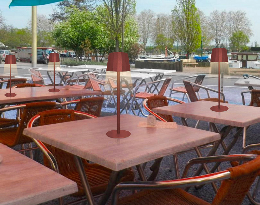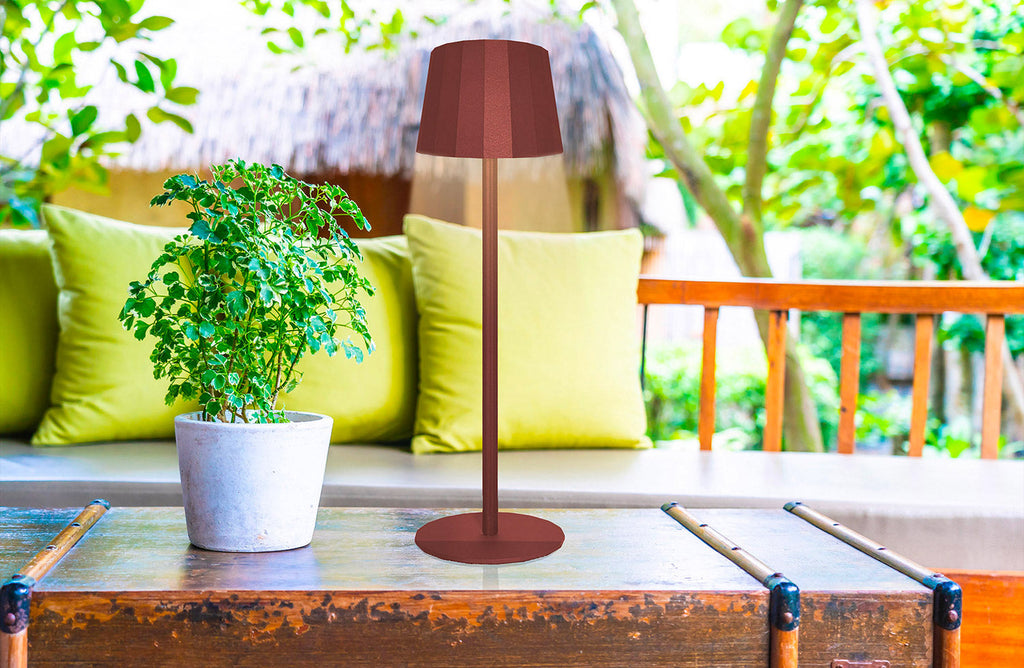 Questa lampada da tavolo è realizzata in ferro per la base e lo stelo, mentre il paralume è in alluminio, conferendole un aspetto elegante e moderno. È dotata di funzione dimmerabile e accensione touch, senza la necessità di fili. Inoltre, può essere ricaricata tramite porta USB. Le sue dimensioni sono di 11,5 cm di diametro e 38 cm di altezza, con un colore predominante Ruggine.