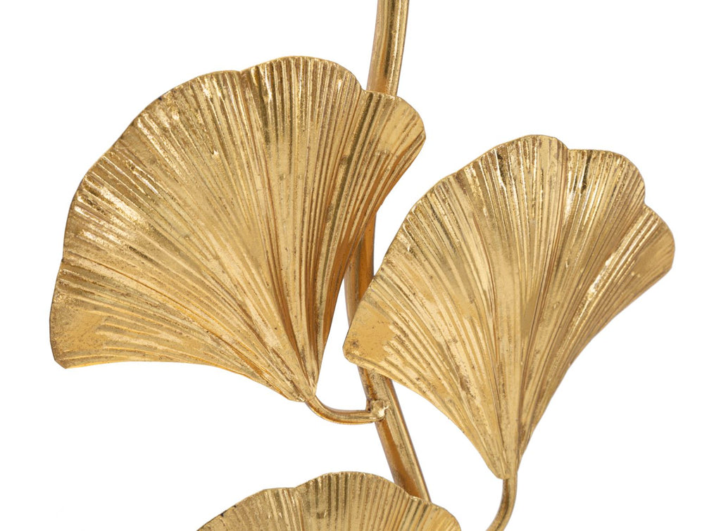 Lampe de table en métal doré avec abat-jour en tissu blanc. La base composée de feuilles rappelle la nature et le design global ressemble à une plante.
