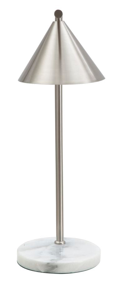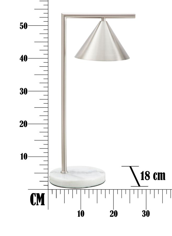 Lampe de table en métal argenté avec socle en marbre. L'abat-jour conique ainsi que les lignes essentielles et épurées de la structure font de la lampe de table Gloty un mélange parfait de modernité et d'élégance !