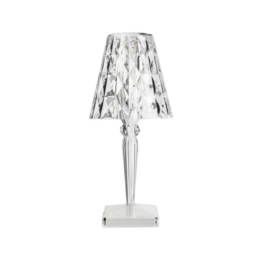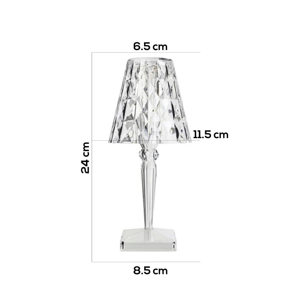 Lampada da tavolo in metacrilato trasparente. Led, risparmio energetico A++, tre combinazioni di luminosità: naturale, fredda, calda. Paralume effetto diamantato. Ricarica con cavo USB in dotazione.