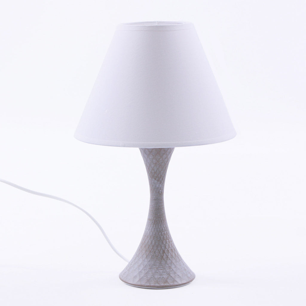 Lampada da tavolo con base in metallo grigio anticato a forma di clessidra e cupola bianca in tessuto. Utilizzabile come abatjour o in ogni ambiente di casa. Shabby chic.