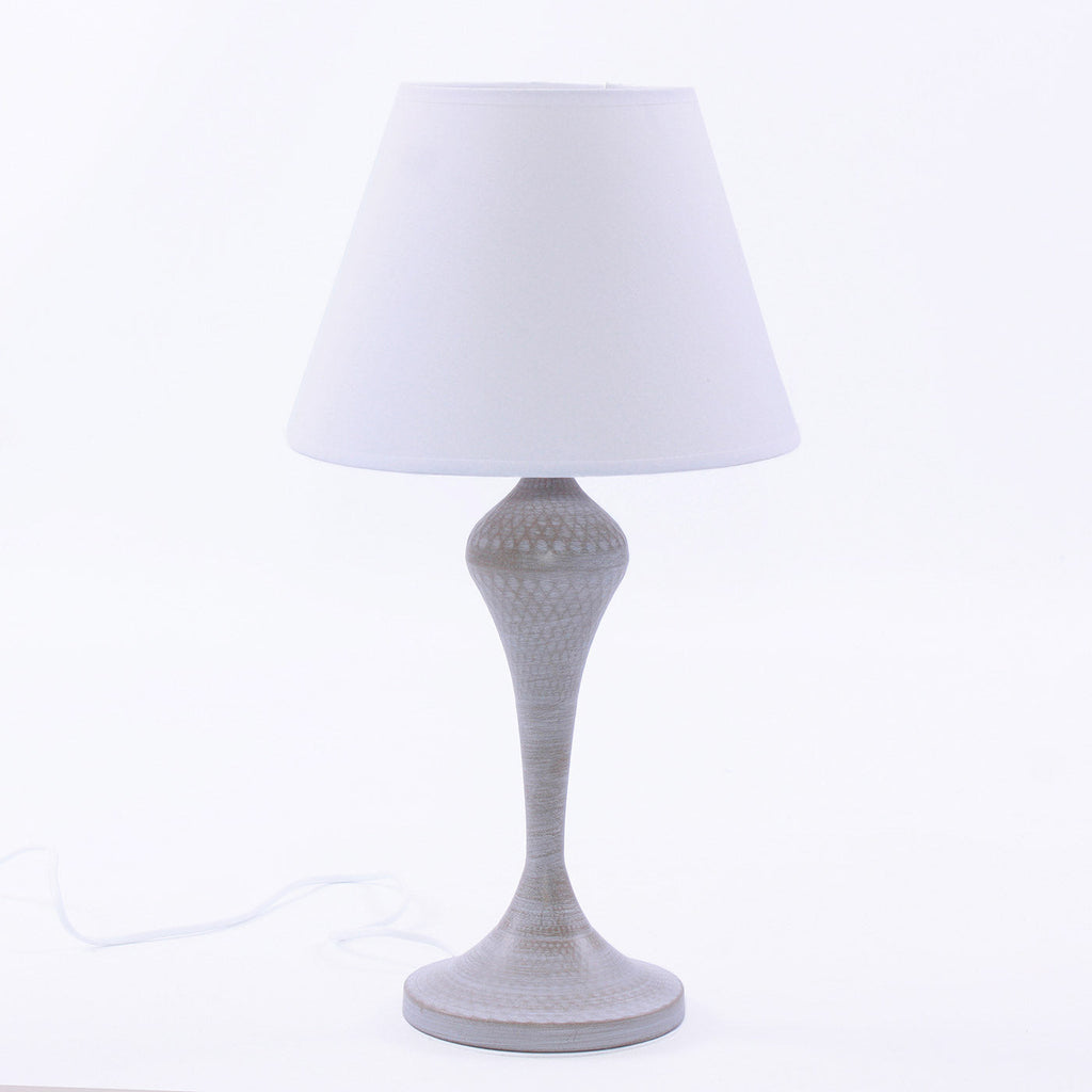 Lampada da tavolo con base in metallo grigio anticato e cupola bianca in tessuto. Utilizzabile come abatjour, in salotto o in ogni ambiente di casa. Shabby chic.