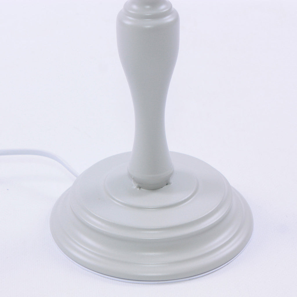 Elegante lampada da tavolo con base in metallo grigio opaco e cupola bianca in tessuto. Un perfetto punto luce per il salotto o per ogni altro ambiente di casa. Shabby chic.