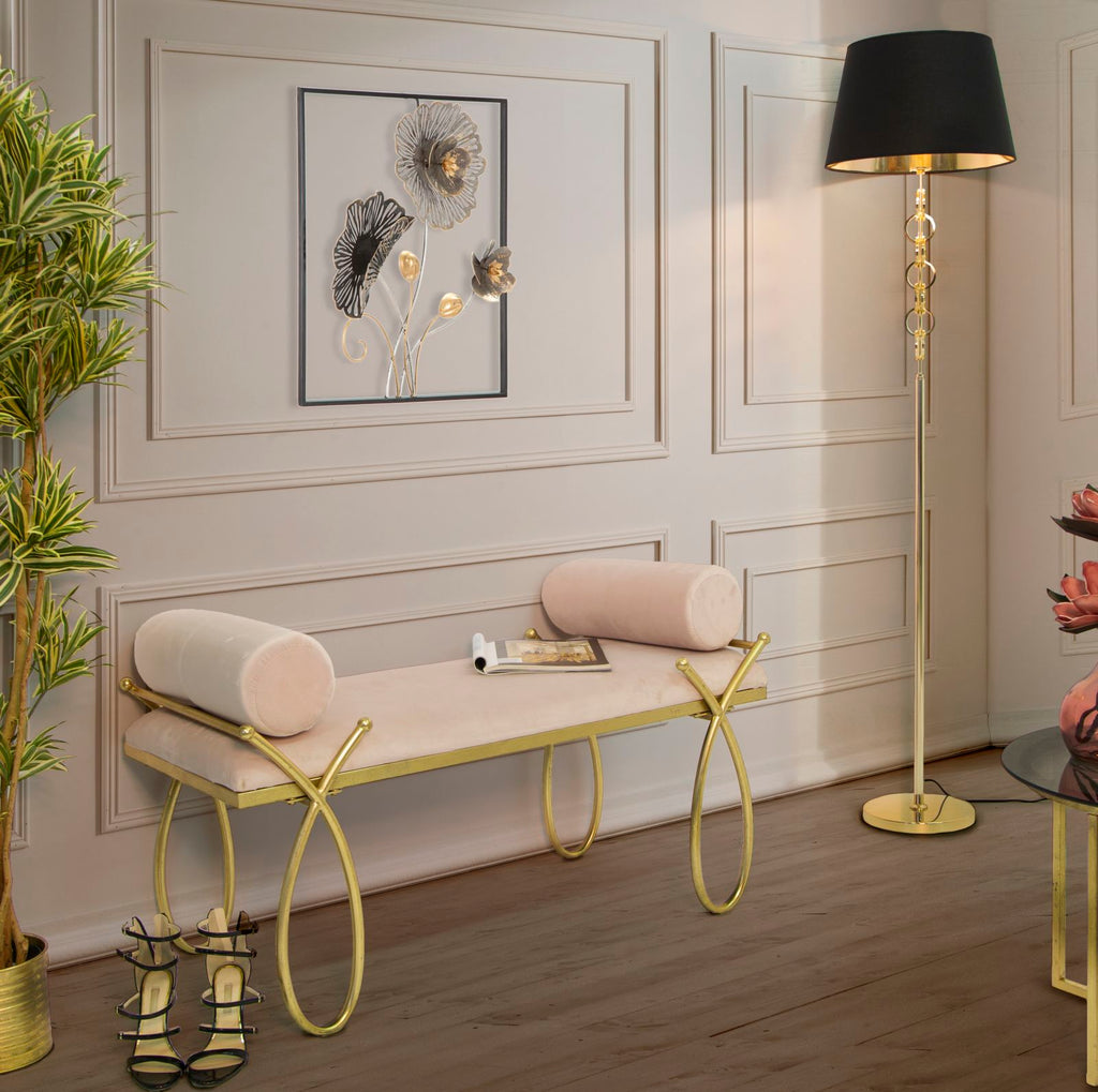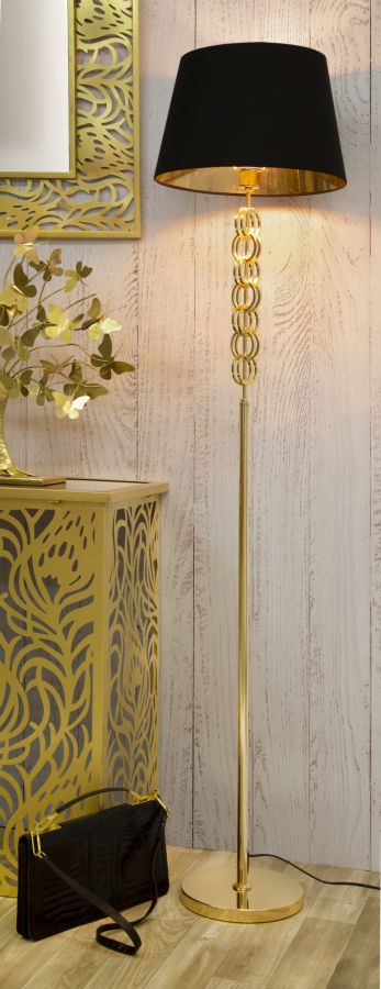 Lampadaire en métal doré avec abat-jour en tissu noir au design géométrique et hypnotique. Le style glam allie détails chics et extravagants. Lampes de table et de sol qui se distinguent par la combinaison d'or et de couleurs vives ou de couleurs plus foncées comme l'ardoise et le noir.