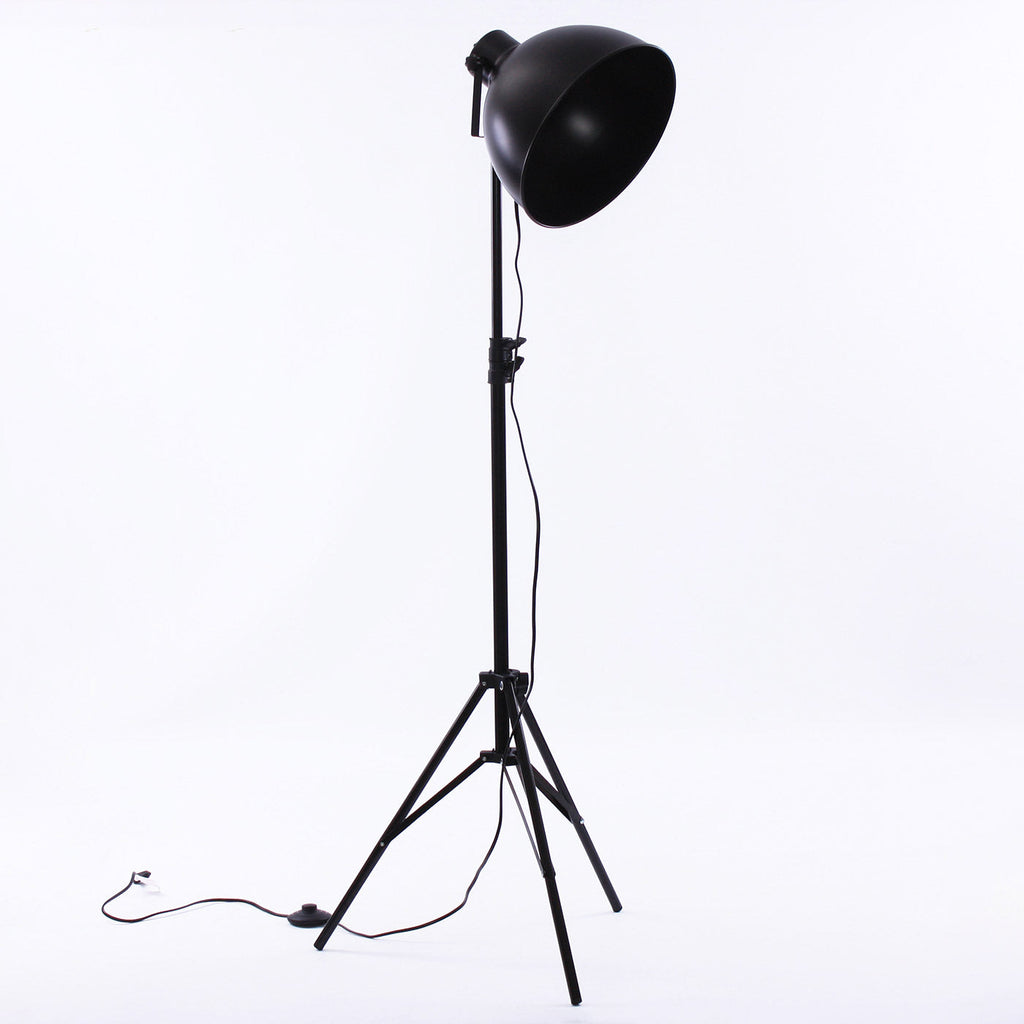 Lampada di design da pavimento realizzata in metallo nero opaco, composta da un faro orientabile con stelo regolabile in altezza e piedistallo a tre piedi. Ideale da studio o salotto di casa. Linea moderna ed essenziale.