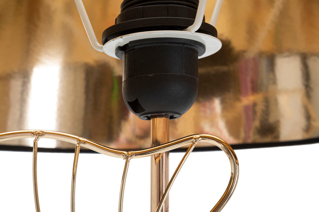 • È realizzata in metallo dorato con paralume in tessuto nero, creando un contrasto perfetto