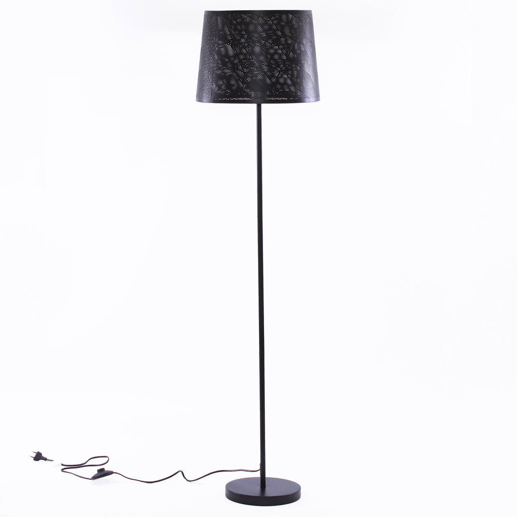 Lampada da pavimento rotonda con piedistallo in metallo nero traforato. Design moderno. Ideale per soggiorno, salotto, camera da letto.