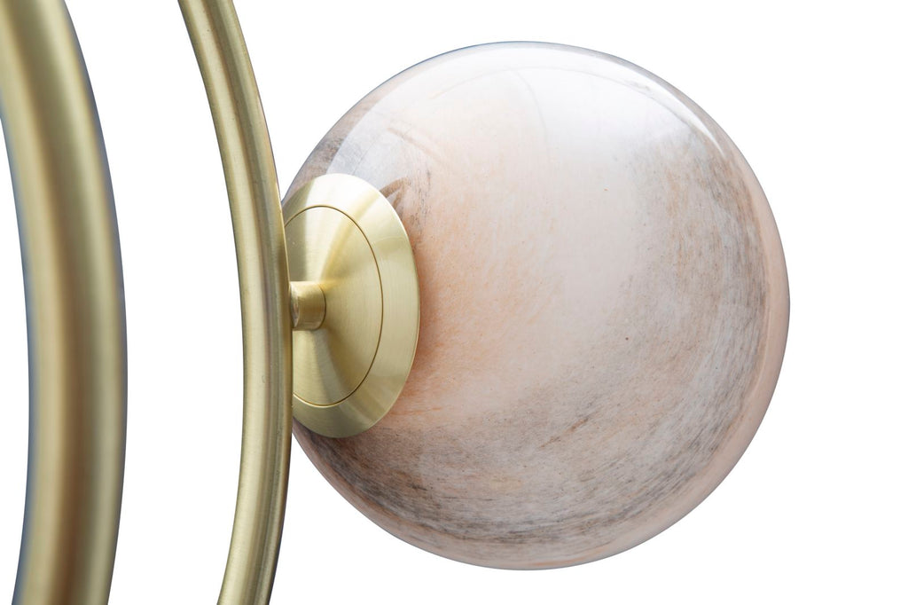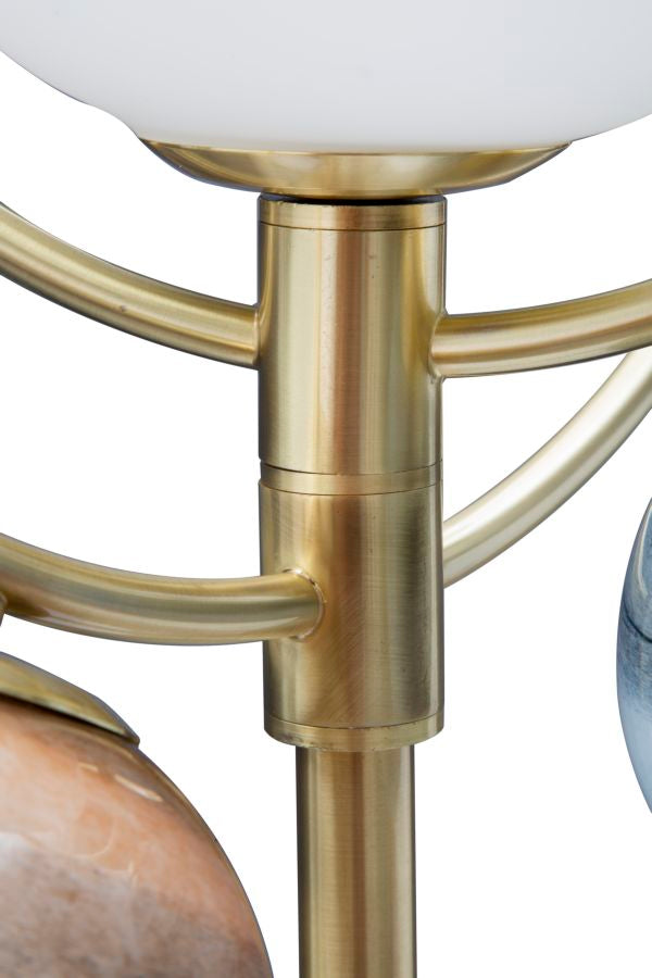 Lampadaire à 7 points lumineux en métal doré avec des sphères en verre opaque qui diffusent une lumière délicate et douce. Des lampes époustouflantes qui reproduisent le système solaire. Une touche de glamour et d'astronomie moderne dans votre maison.