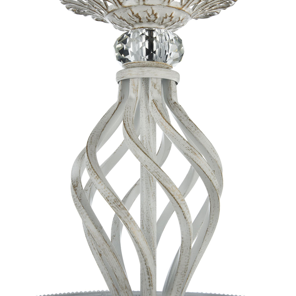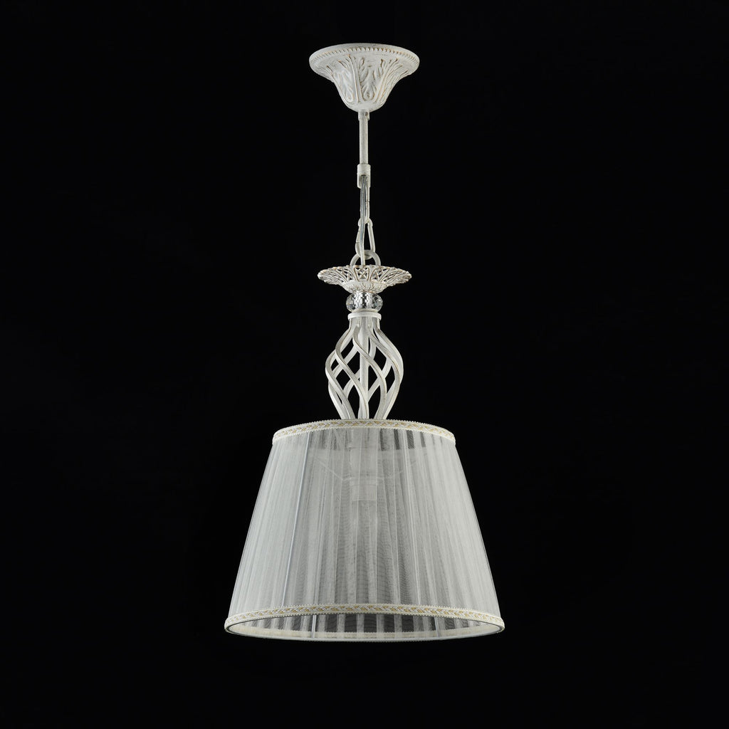 Structure en métal, finition blanc et or. Abat-jour en organza blanc plissé. Pendentifs en cristal.
