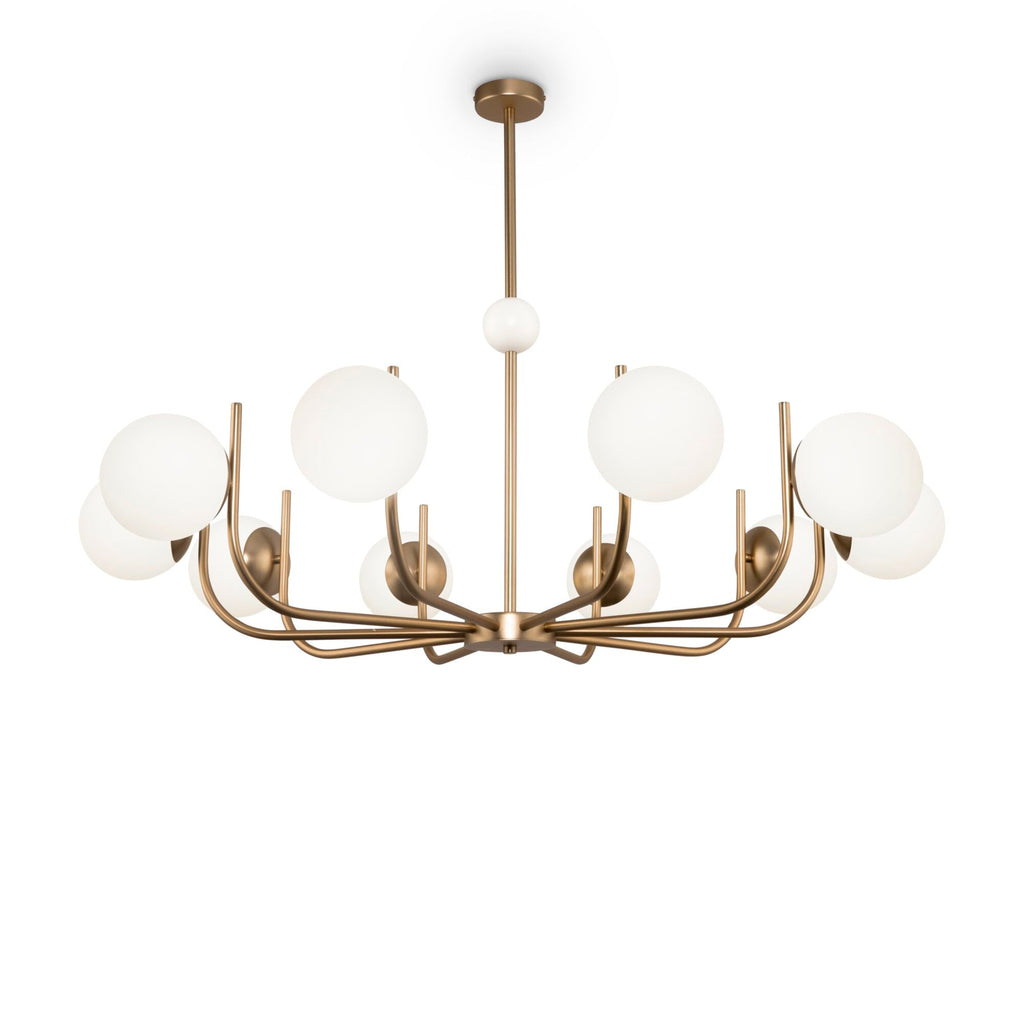 Le design de la lampe est basé sur l'altération de formes simples avec des éléments arrondis. La structure en couleur laiton, les diffuseurs en verre blanc opaque.