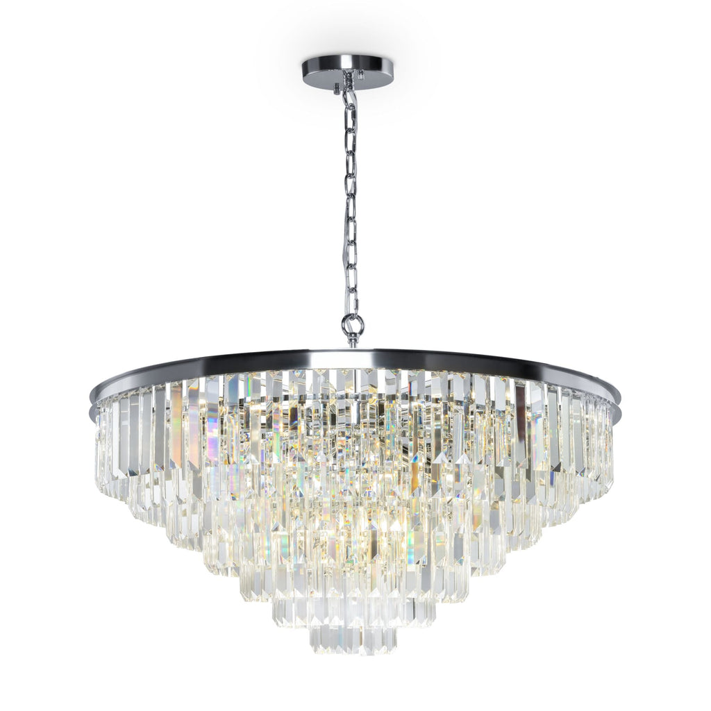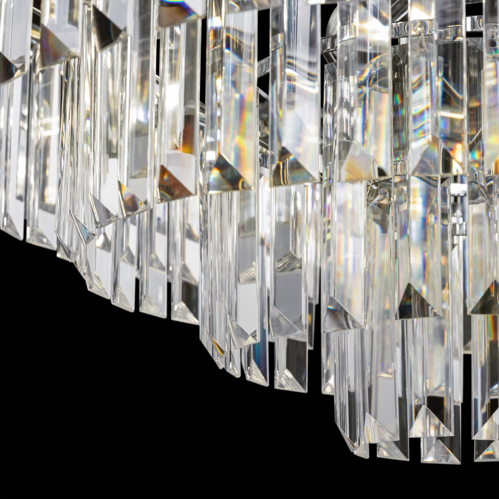 Éléments en cristal suspendus à plusieurs niveaux. La structure en métal est peinte en couleur chrome ou laiton. La hauteur des lampes est réglable