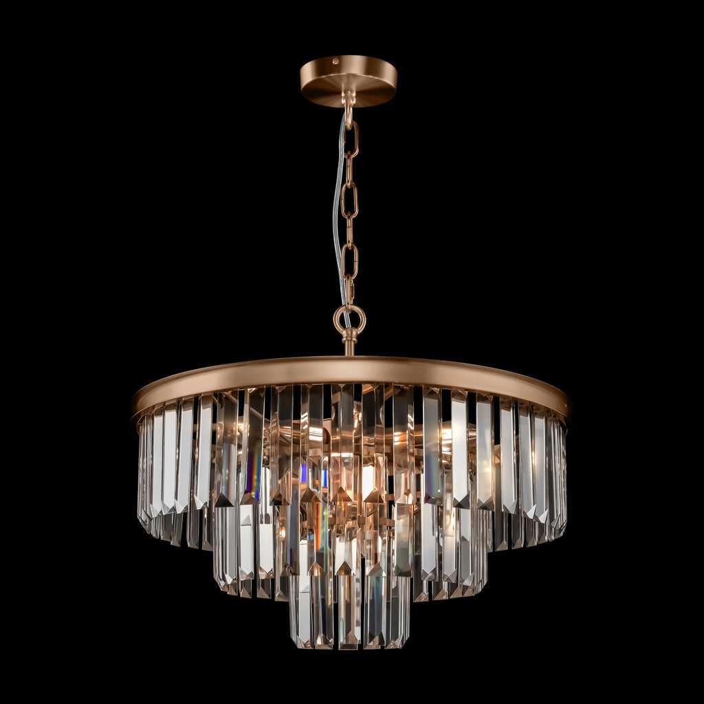 Éléments en cristal suspendus à plusieurs niveaux. La structure en métal est peinte en couleur chrome ou laiton. La hauteur des lampes est réglable