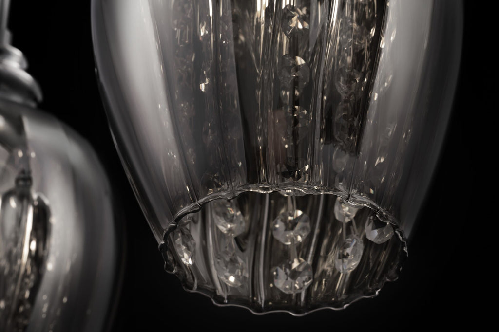 Structure en métal, diffuseurs en verre transparent (MOD044) ou fumé (MOD033). Pendentifs décoratifs en cristal.