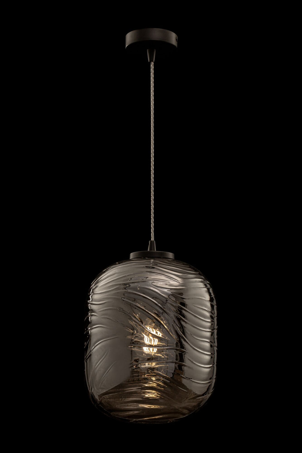 Les diffuseurs en verre opale, transparent et ambre, avec de douces lignes ondulées sur la surface. La hauteur des lampes est réglable par la longueur de la corde.