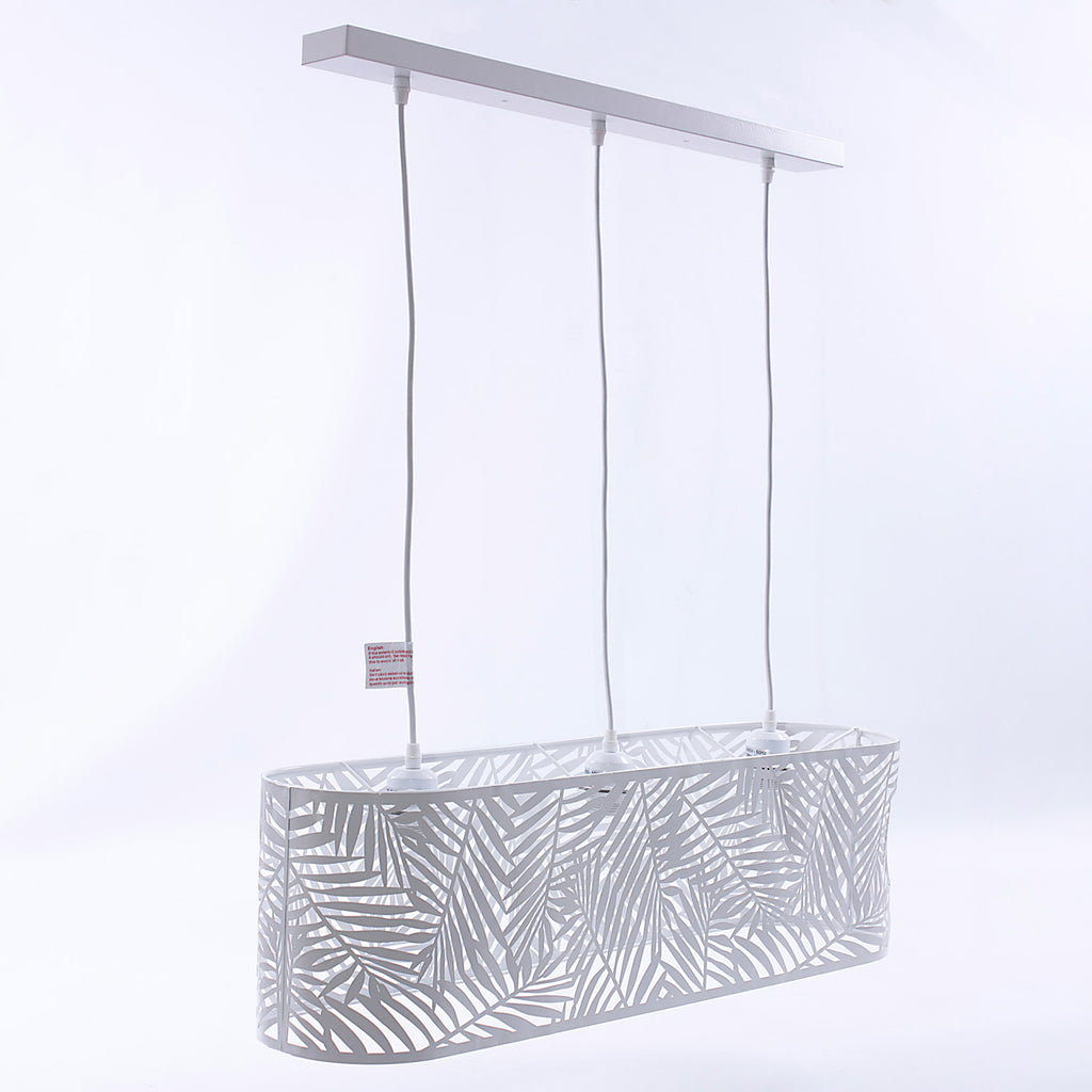 Lampadario ovale a tre luci in metallo bianco traforato con effetto foglie di felce. Design moderno. Ideale per cucina, soggiorno o in ogni ambiente di casa.