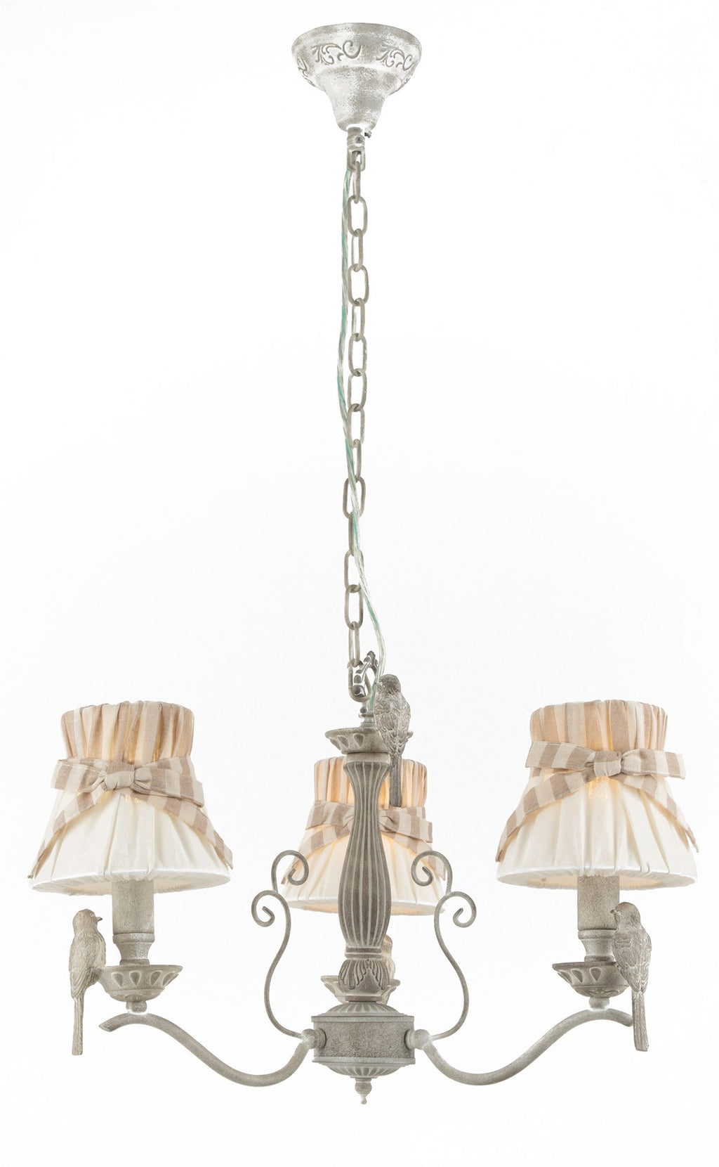 Structure métallique avec éléments décoratifs en polyrésine. Abat-jours amovibles recouverts de lin. Fini blanc antique.