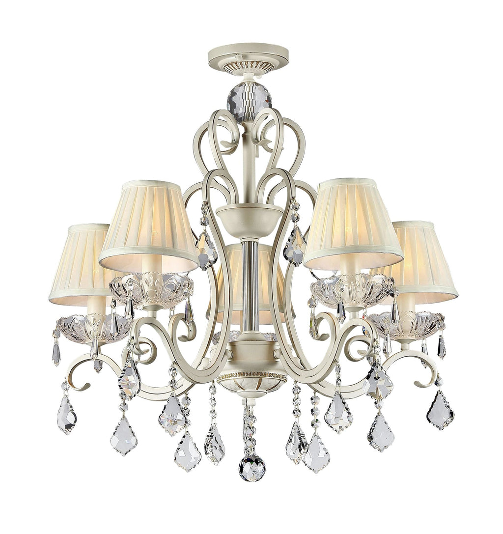 Structure en métal, finition crème dorée. Abat-jour en satin plissé. Pendentifs en cristal.