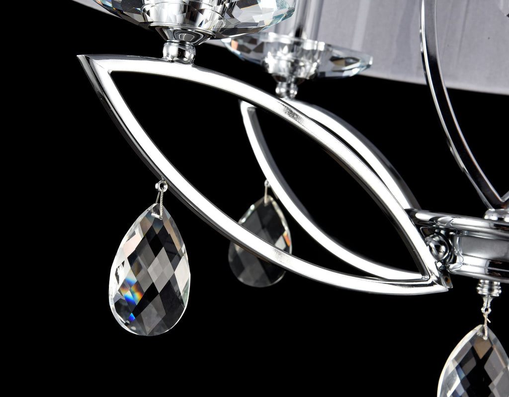 Structure en métal, finition chromée. Pendentifs décoratifs en cristal. Abat-jour en fil blanc.