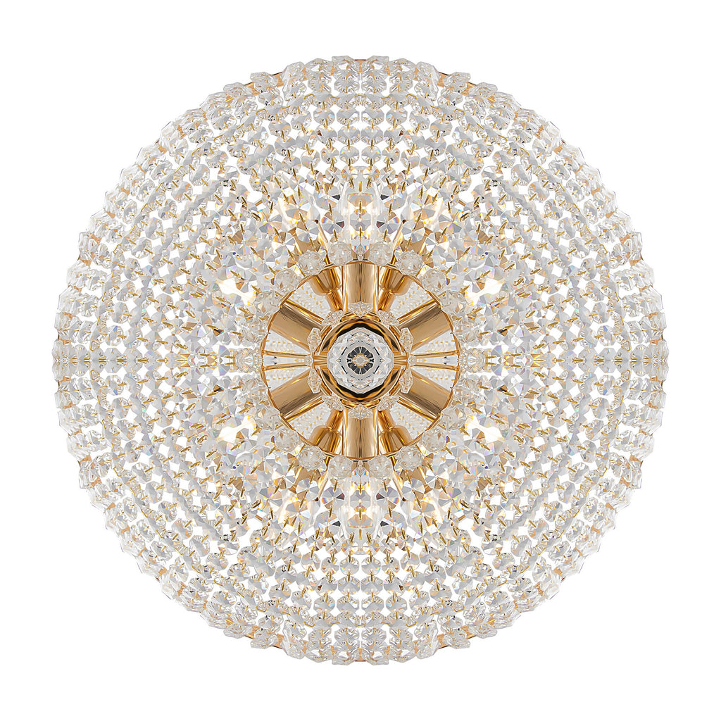 Structure en métal, finition dorée. Cristaux de différentes tailles et formes.