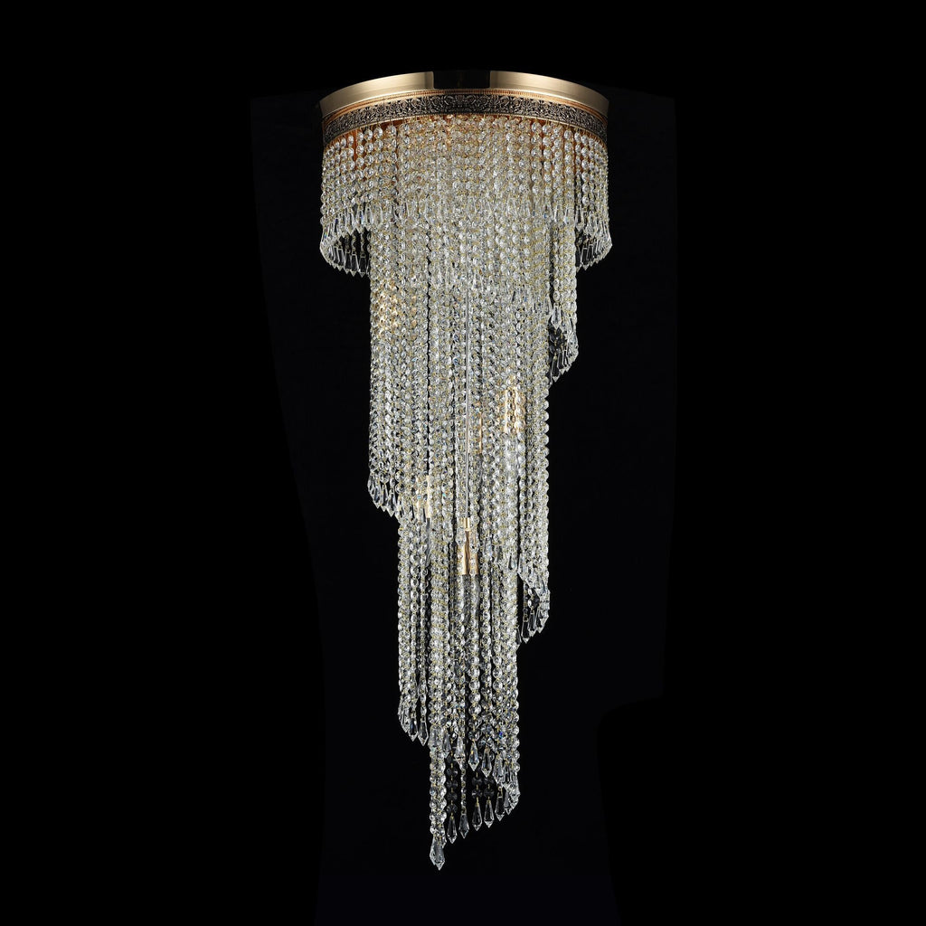 Structure en métal, ruban de laiton, finition or vieilli. Pendentifs en cristal.
